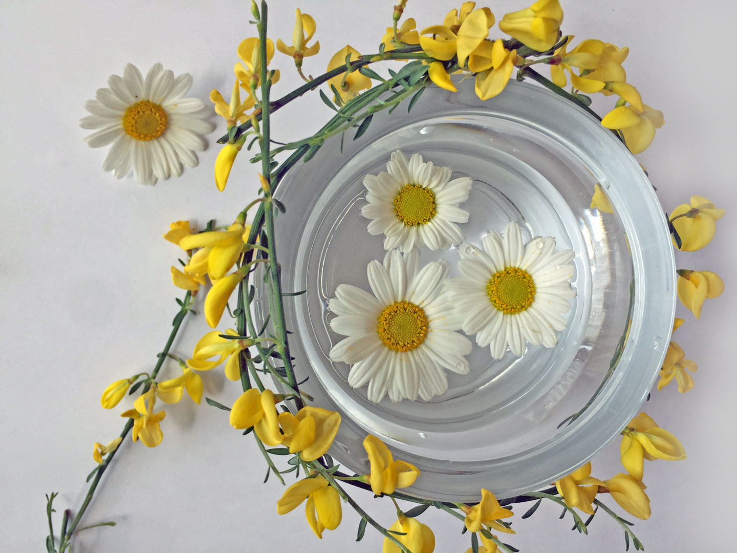 In ein Glaswindlicht etwas Wasser gießen, 2-3 Margeriten Blüten ins Wasser geben. Aus 2 Stielen Ginster einen Kreis basteln und auf das Windlicht legen. Wie ich finde sieht es so hübsch aus, dass ich mir gleich ein zweites für meinen Frühstückstisch gemacht habe.