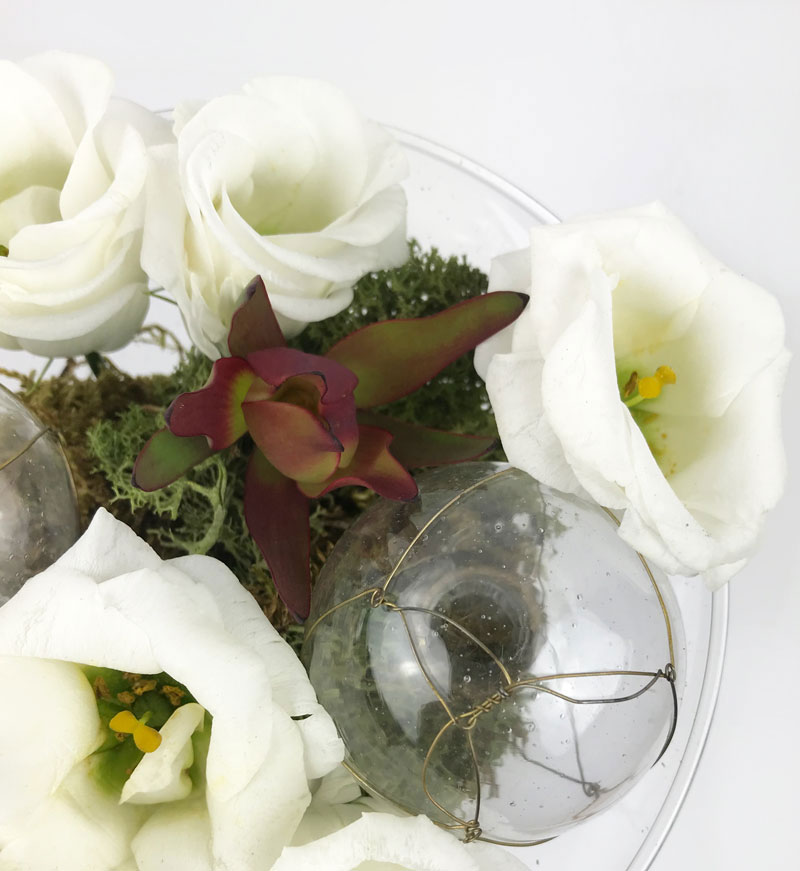 Gekauft habe ich 14 weiße Lisianthus, 8 weiße Rosen in verschiedenen Größen, Leucodendron, Eukalyptus und eine schöne Deko-Glaskugel, die ich immer wieder einsetzen kann. Aber irgendetwas hat noch gefehlt, richtig, frisches Moos. Das habe ich mir bei einem Spaziergang direkt aus dem Wald mitgenommen. Ansonsten ist nur ein dekoratives und geeignetes Gefäß wichtig. Ich habe mich für ein großes Glas mit breitem Kelch und meine Vintage Deko-Schublade entschieden.