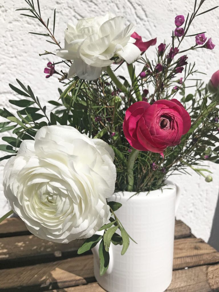 Ich gebe zu, diesen Strauss mit weissen und roten Ranunkel sowie Waxflower habe ich im Supermarkt gekauft. Die Qualität der Blumen war in Ordnung und auch der Preis mit 5,99 Euro durchaus günstig.