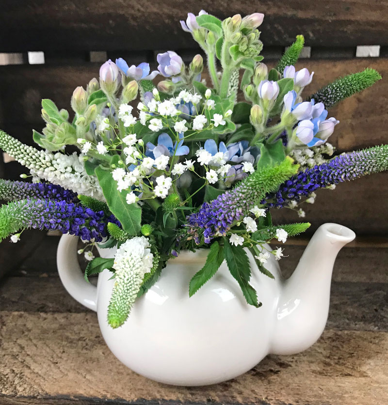 Ob auf dem Tisch oder als blumiges Mitbringsel, Blumen in weiss-blau wirken frisch und dennoch edel. Wunderschön wirkt der zarte Blumenstrauss in einer schlichten Glasvase oder wie hier in einer rustikalen Kanne. Als Mittelpunkt ein Stiel Oxypetalum mit seinen zarten himmelblauen Blüten, dazu Veronika in blau und weiss ringsum gebunden. Mit einigen Zweigen Schleierkraut habe ich den Strauss abgerundet. Habe mich entschieden – der weiss/blaue Blumentraum bleibt auf meinem Esstisch und wird nicht verschenkt.