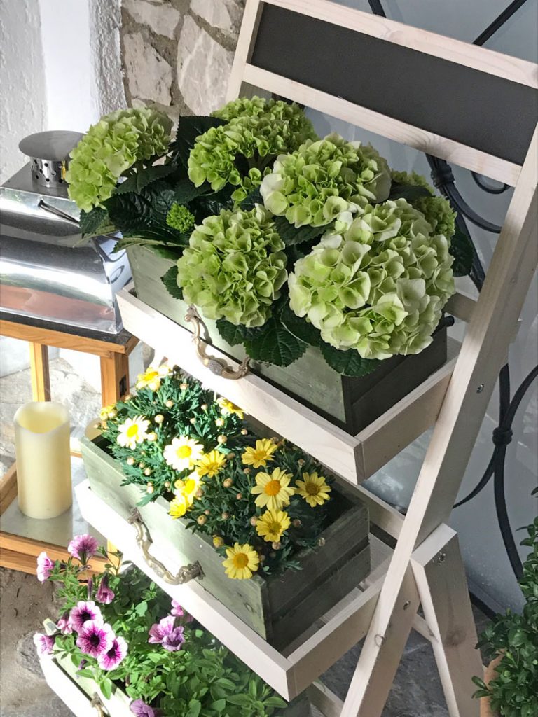 Dafür habe ich mir eine kleine Holzleiter mit 3 Sprossen zugelegt, dazu Übertöpfe in Schubladenform die ich mit Horstensien, Petunien und Kapkörbchen bepflanzt habe. Natürlich darf eine Laterne mit sanfter Beleuchtung und ein Buchsbäumchen nicht fehlen.