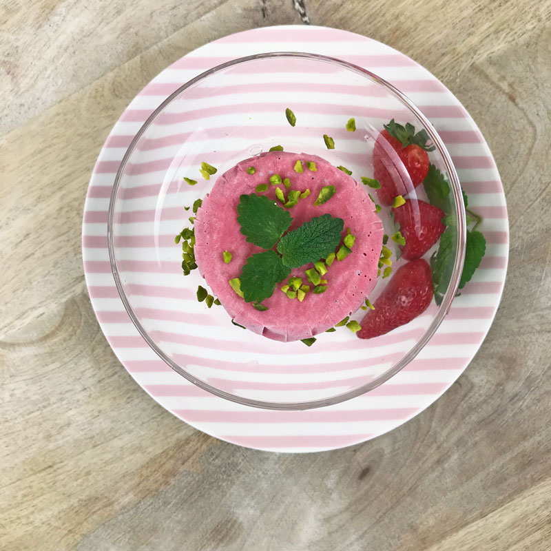 Die Erdbeeren waschen und im Mixer einigen Minzblätter fein pürieren. Die Milch und den Saft einer halben Zitrone mit dem Zucker verrühren, bis sich der Zucker aufgelöst hat. Die pürierten Erdbeeren dazugeben. Die Sahne steif schlagen und in die Erdbeermasse unterheben. Die Masse in kleine Muffin-Papierförmchen geben und für ca. 1 Stunde in den Gefrierschrank. Mit einigen Blättern Minze und Pistazienkernen verzieren und geniessen.