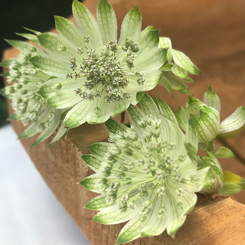 Sterndolden gehören zur Familie der Doldenblütler. Die Blüten erinnern mich an dutzende kleine glitzernde Stecknadeln. Der sternförmige Grund, der diese Stecknadeln umgibt, sind verfärbte Hüllblätter. Sie behalten ihre Leuchtkraft noch, wenn die eigentlichen Blüten bereits abgefallen sind. Deshalb eignen sich Sterndolden hervorragend für die Vase und das gleich für zwei Wochen.