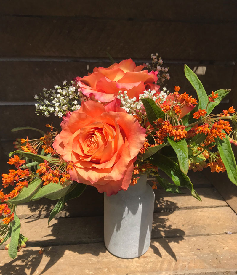 Für dieses Wochenende habe ich – wieder einmal – Rosen ausgesucht. Das leuchtende Orange hat mir besonders gut gefallen und Asclepia (auch Seidenpflanze genannt) das sommerliche Beiwerk, welches Akzente in warmen Farben setzt.