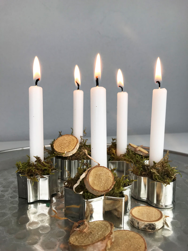 Sogar Plätzchen Ausstecher werden hierfür genutzt, den es muss nicht immer Farbe und Glitzer sein. Dafür habe ich den Steckschwamm als Kerzenhalter benutzt, diese in passender Größe zugeschnitten und in die Ausstecher gestellt. Mit Moos ausgefüllt und mit Mini Birkenholzscheiben dekoriert. Damit das Kerzenlicht besonders schön zu Geltung kommt, stehen die Kerzen auf einem Silbertablett das jetzt meinen Esstisch ziert.