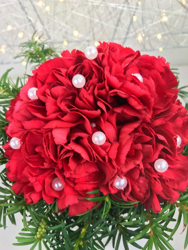 Für die jüngere Generation gilt sie heute noch ein wenig spiessig, aber ich kann meine Nachbarin gut verstehen, wenn sie eine grosse Leidenschaft für Nelken hat. Nelken haben für den Geschmack etwas zu bieten, den selbst die Blütenform variiert von Sorte zu Sorte. Als kleines High-Light habe ich zwischen den Blüten kleine Perlen an den Strauss gesteckt.