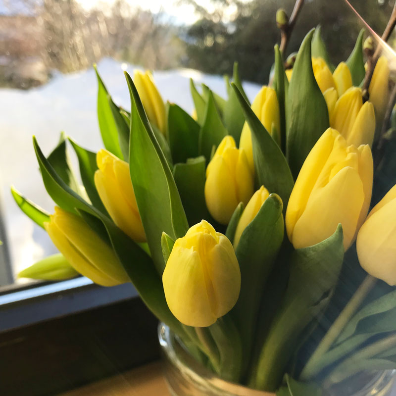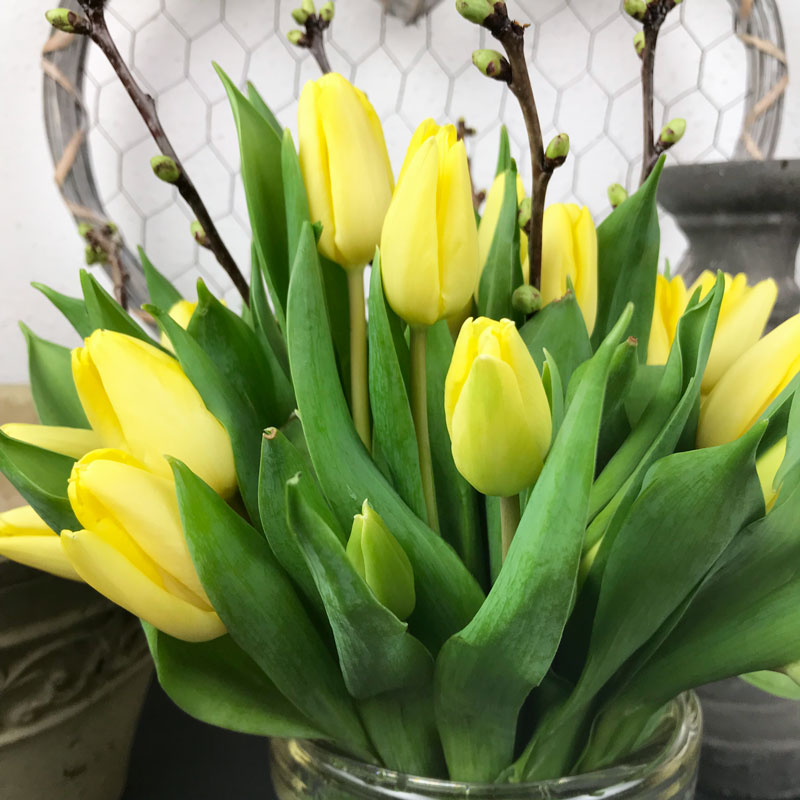 Die gelbe Tulpe zählt neben den weissen und rote Tulpen zu den beliebtesten Frühlingsblumen hierzulande. Die gelbe Tulpe strahlt wie der Sonnenschein, der mir im Moment oft sehr fehlt und ich warte sehnlichst darauf wenn in meinem Garten die Tulpensaison beginnt. Bei den Bildern sieht man im Hintergrund immer noch Schnee – ein schöner Kontrast – Frühling und Winter. Die Tulpe braucht kein grosses Beiwerk, wenn ja genügen ein paar Heidelbeerzweige oder Palmkätzchen, die schon im Handel erhältlich sind.