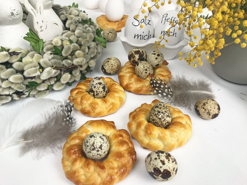 Heute stelle ich euch einen Last-Minute Osterkörbchen Idee vor. Die kleinen Kränzchen sind aus Hefeteig und eignen sich als Mitbringsel oder Eierbecher für das Frühstücksei. Die meisten Zutaten habt ihr bestimmt zu Hause und es kann gleich losgehen