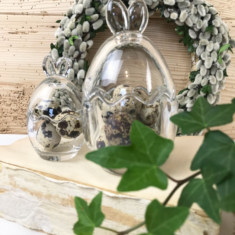 Die hübschen Gläser in Form von Häschenohren habe ich letztes Jahr bei Depot gefunden. Die Gläser sehen nicht nur hübsch aus, sondern können mit Wachtel- oder Schokoladeneier befüllt werden. Das Weckglas habe ich mit einer Hyazinthe, Wachteleier und Moos geschmückt, was nur wenige Minuten Zeit in Anspruch nimmt.