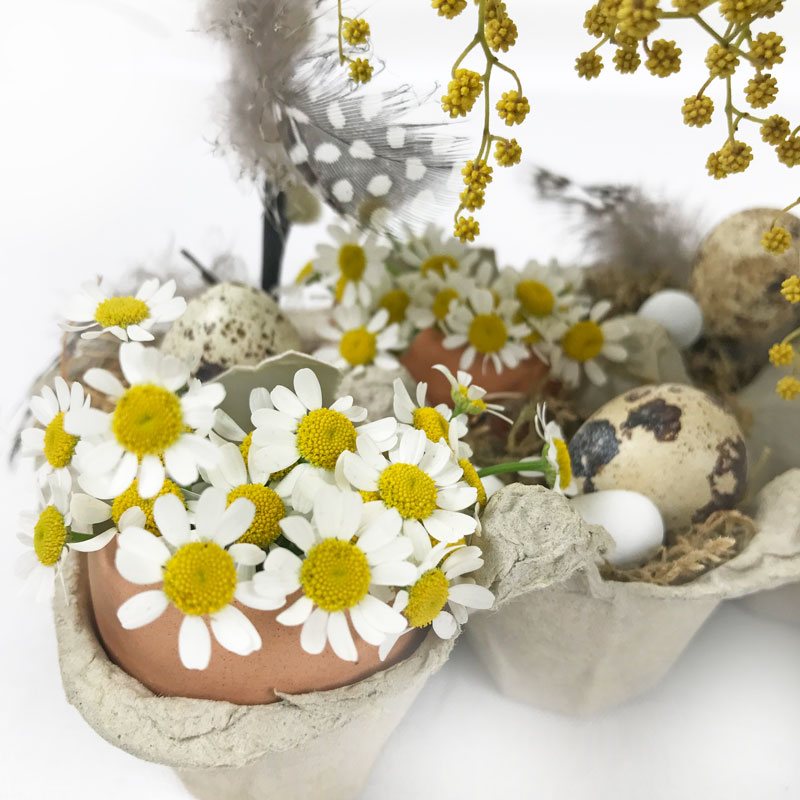 Besondern hübsch sieht es aus wenn die übrigen Fächer mit Moos, Heu, Wachteleier und Federn geschmückt werden. Die zarten Kamilleblumen, die mich sehr an Gänseblümchen erinnern, sind für mich der Frühling.