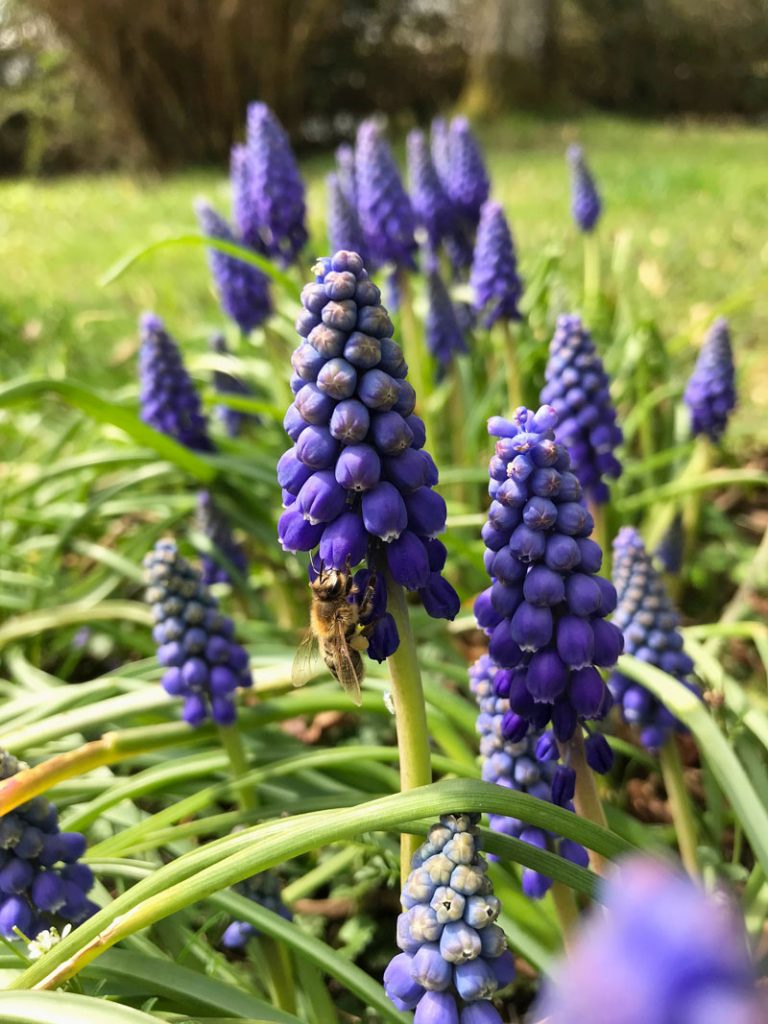 Umso erfreulicher, die hübschen blauen Traubenhyazinthen, die ich auch im Herbst eingesetzt habe, sind nun voll erblüht. Ihr Name leitet sich von der Form der Blüte ab, die an auf dem Kopf stehende Weintrauben erinnert.