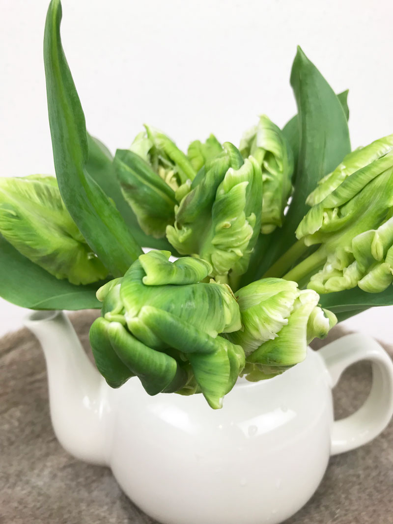 Die „Super Parrot“ Tulpe, die ich bei Blumigo bestellt habe, ist mit ihrer ungewöhnlichen Blütenform ein absoluter Hinkucker, auch wenn meine Tochter meinte, sie sehen aus wie kleine Salatköpfe. Erfrischend in weiss und grün gehört sie mit ihrer exklusiven Form zu den Papageien Tulpen. Bei meiner Floristin habe ich für meinen Strauss gelbe Riesen Freesien entdeckt und die Tulpen zusammen mit Mimosen zu einem hübschen Frühlingsstrauss gebunden.