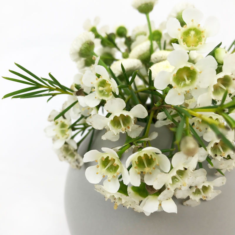 Die Blüten sind rosa, weiss oder zart violett und die Blätter wirken nadelähnlich. Die Waxflower duften herrlich nach frischem Zitronengras und das schöne, sie halten in der Vase ungewöhnlich lange, wenn das Wasser jeden zweite Tag gewechselt wird.