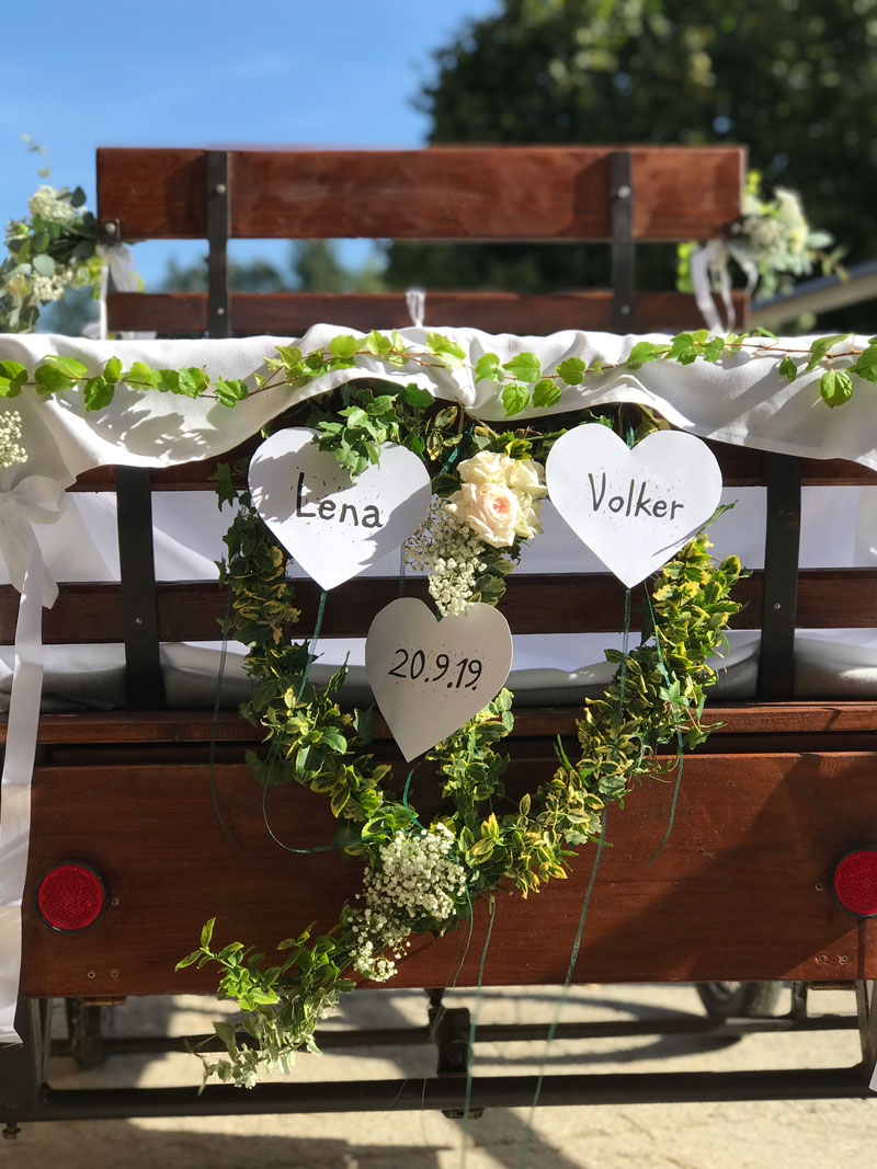 Ich habe dann zugesagt, die Kutsche zu schmücken und bei meiner Recherche habe bei Pinterest ein Herz aus Efeu und Blumen gefunden, was am Rücken der Kutsche angebracht wurde. Für den Grundstock des Herz, habe ich Zweige aus meinem Garten verwendet. Was aber schwerer war als ich es mir vorgestellt habe. Die Zweige müssen biegsam sein, aber auch Halt für den Efeu bringen und erst nach dem 4. Versuch war das Herz soweit fertig, dass ich am Freitag morgen nur noch den Efeu, die Blumen und die Namen befestigen musste.