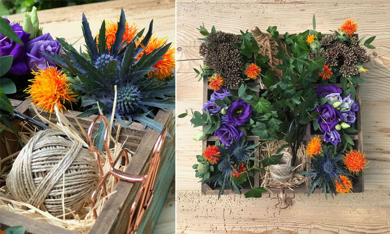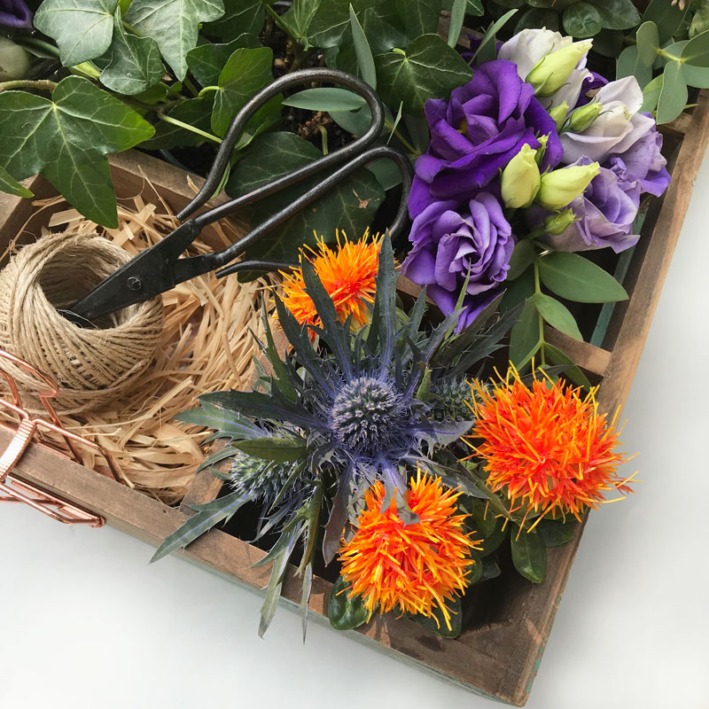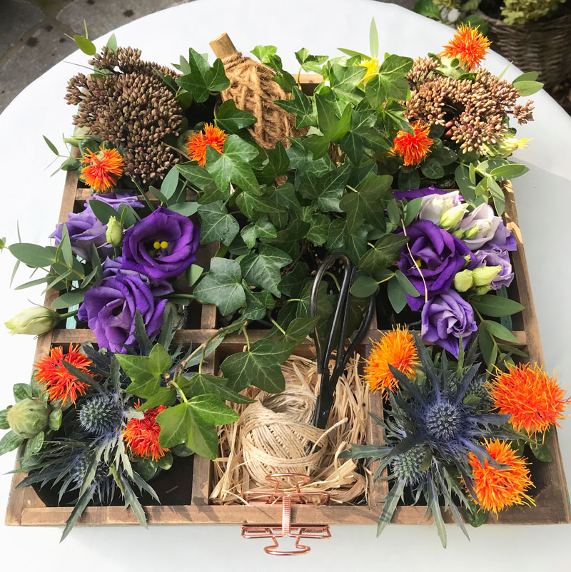 Dafür habe ich mir blauen Lisianthus, orange Carthamus (Fäberdieseln) blaue Disteln, Fette Henne und Efeu aus dem Garten ausgesucht. Da alle Blumen stark verzweigt sind, sind sie ideal für kleine Blumenvasen.