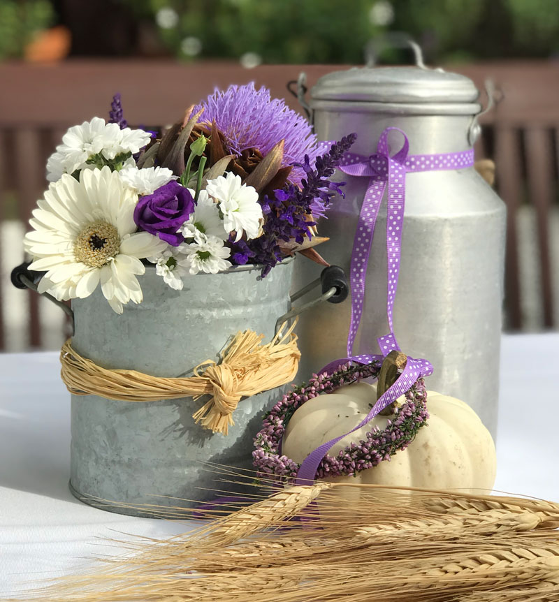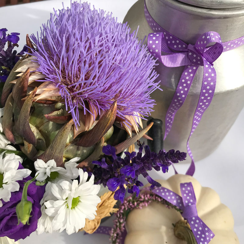 Diese Blume ist etwas ganz besonderes, pflegeleicht und auch als Trockenblume bis weit nach Weihnachten verwendbar. Gerade jetzt im Herbst leuchtet die Artischocke in ihrem satten violett Ton und wirkt besonders schön wenn die Blume im Zentrum des Arrangements platziert wurde. In meinem Strauss habe ich ausserdem Gerbera, weisse Chrysanthemen und lila Lisianthus mit eingebunden.