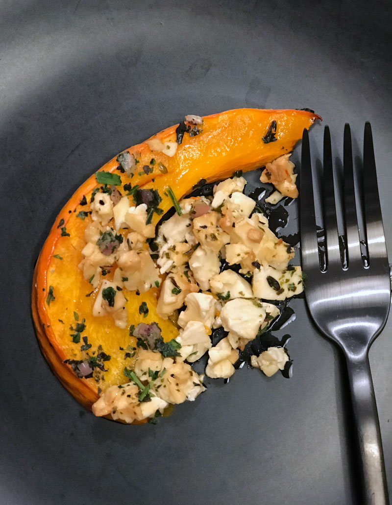 Vom Kürbis blieb fast die Hälfte übrig und das Gericht Kürbis mit Feta, habe für den kleinen Mittags Snack gemacht.