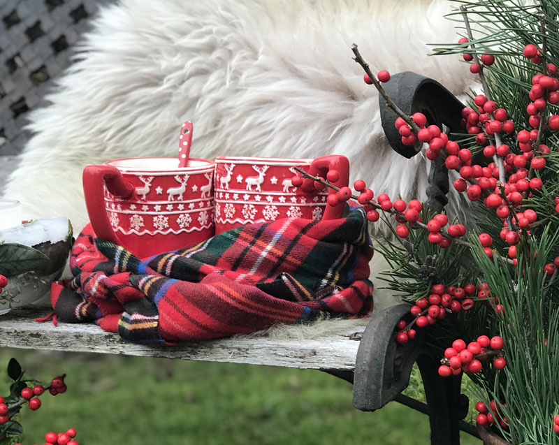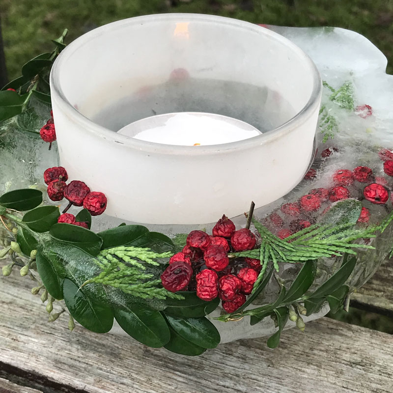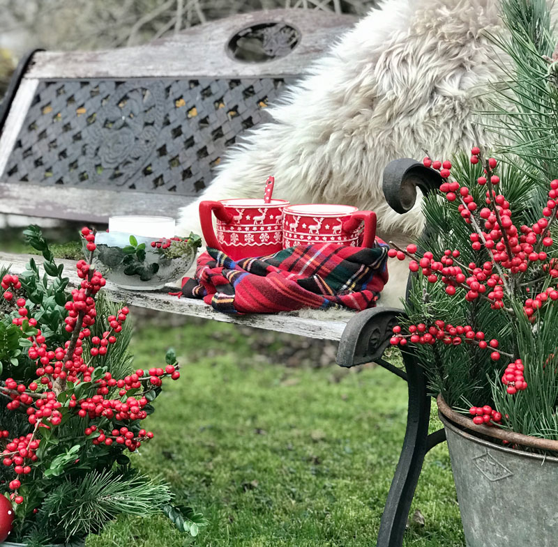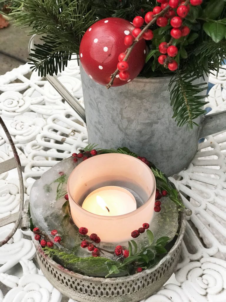 Noch geniesse ich das schöne Wetter, bei langen Spaziergängen oder mit einer Tasse heissen Tee im Garten. Nur schade, dass mein Eisblock, geschmückt mit Ilexbeeren, Koniferen und Buchszweigen nicht lange gehalten hat und regelrecht in der Sonne geschmolzen ist.