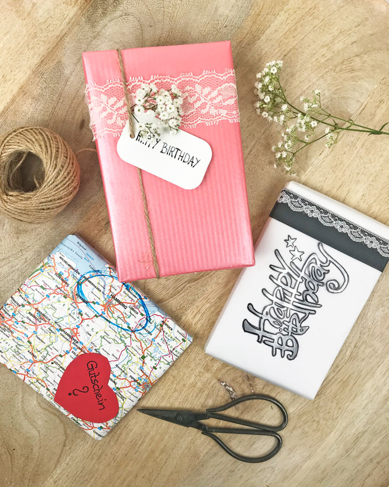 Beim dritten Gutschein – eine Städtereise nach Hamburg – haben mehrere Personen mitgewirkt. Die Verpackung bliebt mir überlassen und dafür habe eine alte Strassenkarte verwendet und den Gutschein verpackt. Die Stadt Hamburg eingekreist und auf das Herz – Gutschein mit Fragezeichen gezeichnet. Ein vielsagendes Päckchen, obwohl die Beschenkten dann doch sehr überrascht waren.