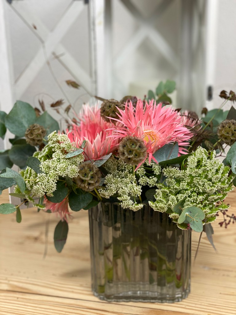 Mein Blumenstrauss für das Wochenende ist zusammengestellt mit rosa Gerbera, Dill, Skabiosen, Eukalyptus und Gräser. Gerbera gehören noch immer zu den am stärksten nachgefragten Schnittblumen. Sie warten in poppigen und zarten Farben auf und die Form der Blütenblätter variiert je nach Sorten.