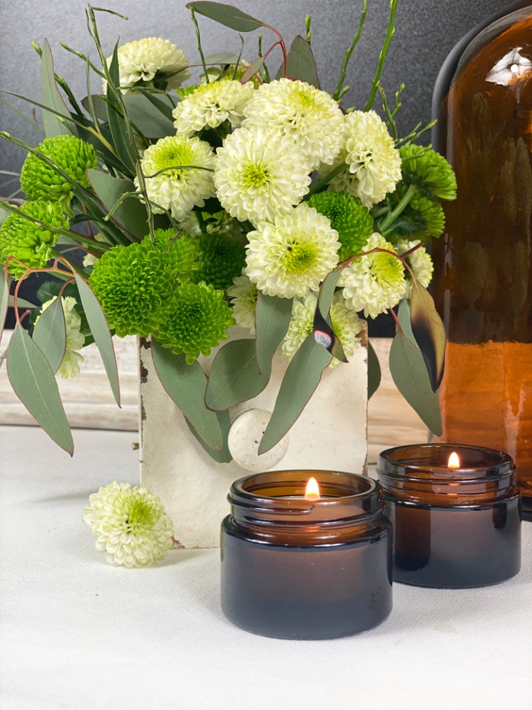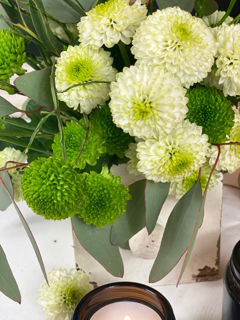 Zusätzlich habe ich für meine Tischdeko einen Strauss aus Eukalyptus mit weissen und grünen Chrysanthemen gebunden und die Vase in eine Schublade gestellt. Chrysanthemen sind das ganze Jahr über erhältlich, bei richtiger Pflege lange haltbar und für mich mehr als nur Friedhofsblumen.