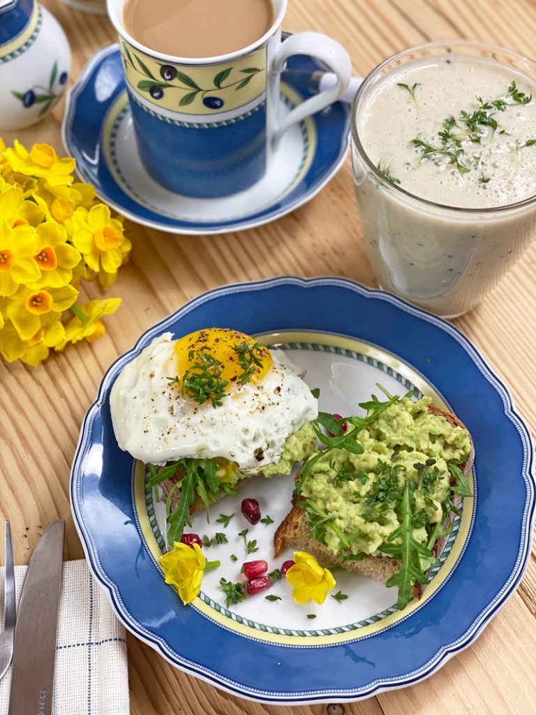 Für den Milchshake eine Kiwi, eine Banane, 1/3 der Avocado, Zitronensaft und 1 TL Honig. Zuerst habe ich das Avocado Fleisch mit einer Gabel zerdrückt und ca. 1/3 – für meinen Milchshake – zur Seite gestellt. Die fein gewürfelten Zwiebel und den Zitronensaft hinzu. Mit Salz, Pfeffer aus der Mühle und Kresse nach Geschmack würzen. Die Scheibe Bauernbrot mit Ruccola belegen, die Avocado aufstreichen, das gebratene Spiegelei dazu und mit Kresse und Granatapfelkerne garnieren. Für meinen Milchshake habe ich eine Kiwi, eine Banane und Avocado, mit frischer Vollmilch, etwas Zitronensaft und Honig gemixt.