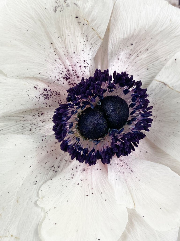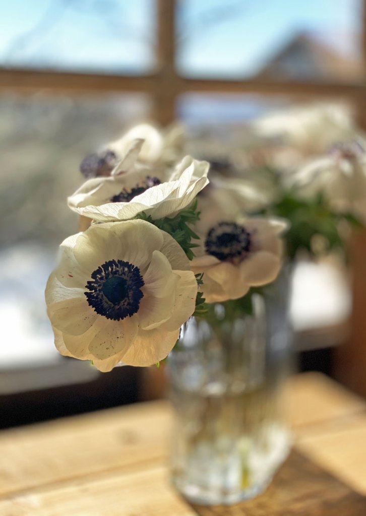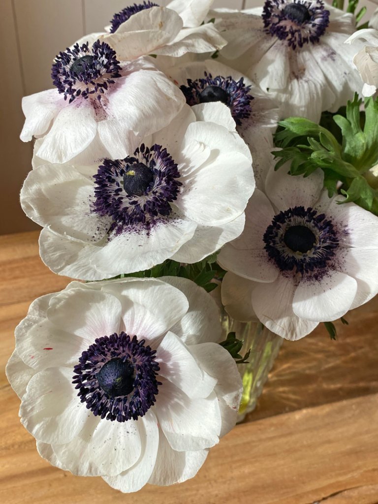 Anemonen sollten in einem kühlen Raum stehen, das Wasser kalt sein und die Obstschale sehr weit entfernt stehen. Wenn die Anemonen ihre Köpfchen hängen lassen, einfach nochmal anschneiden und die Haltbarkeit wird um einige Tage verlängert. Beim durchsehen der Bilder habe ich nachträglich festgestellt, das eine Anemone in der Mitte zwei Herzen hat – ein kleines Wunder der Natur.