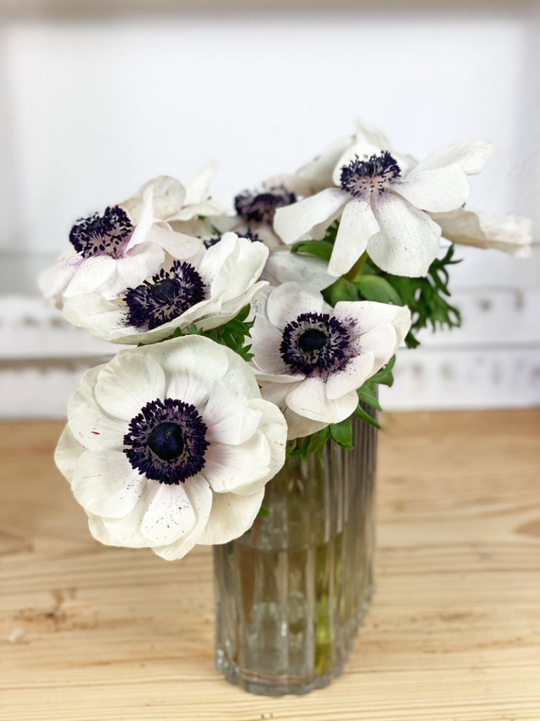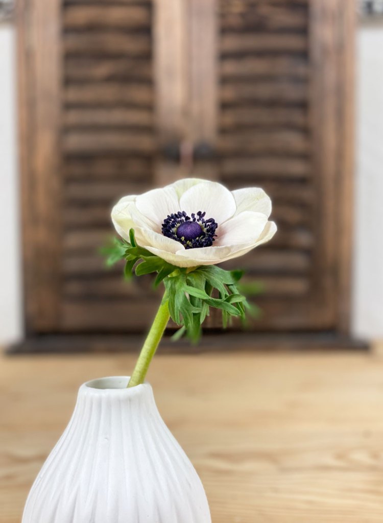 Anemonen sind besonders zauberhafte Frühlingsblumen mit einer sehr ausdrucksstarken Blüte. Die Sorte in weiss hat einen schönen Kontrast zu der dunklen Blütenmitte. Sie wirken sehr zart, ja schon fast zerbrechlich und tatsächlich sind sie auch empfindlich.