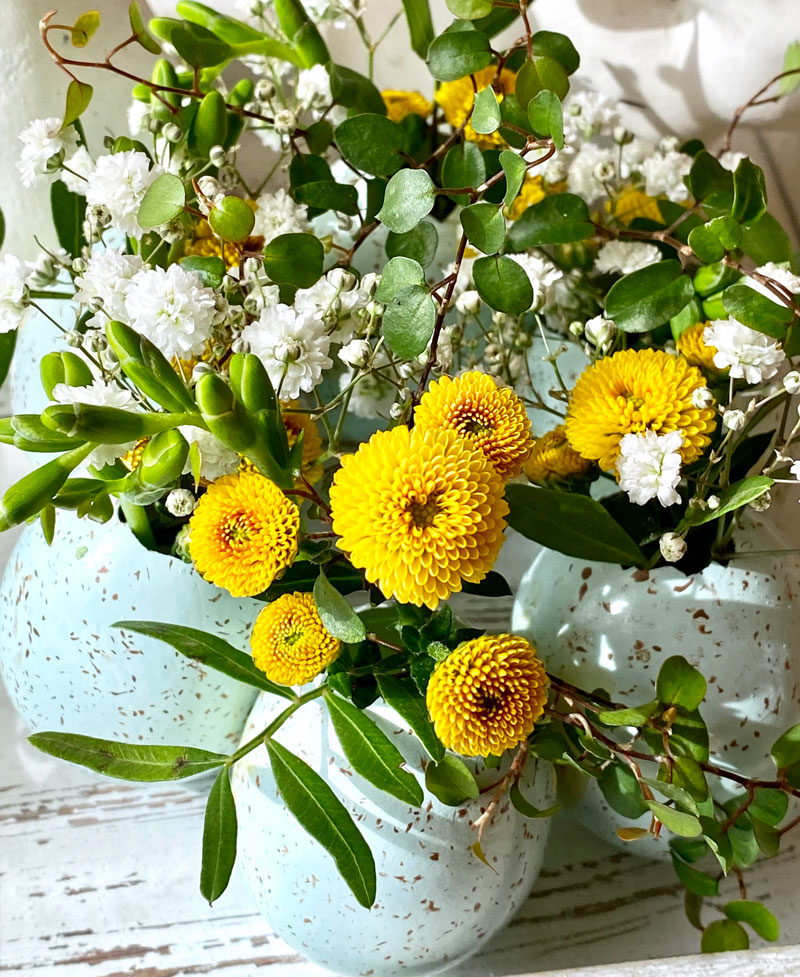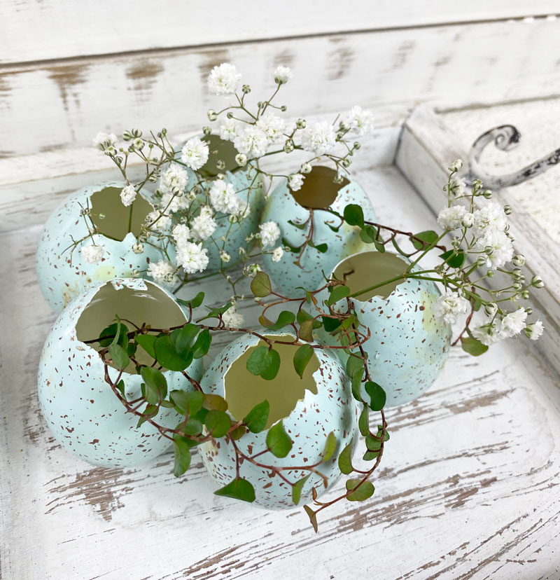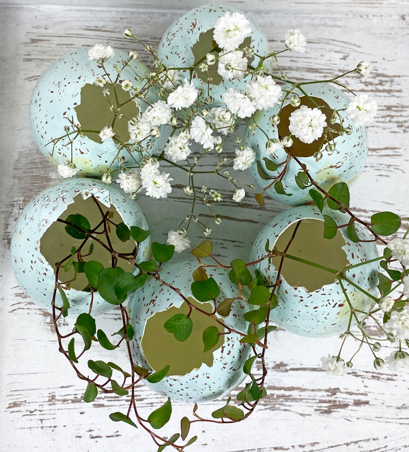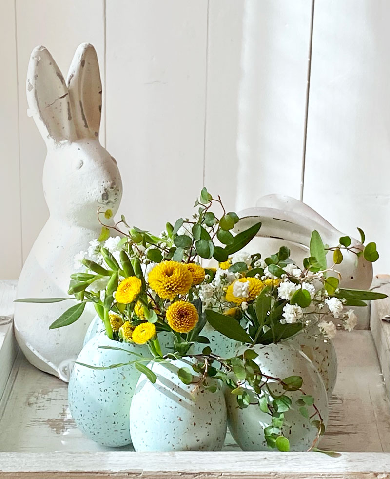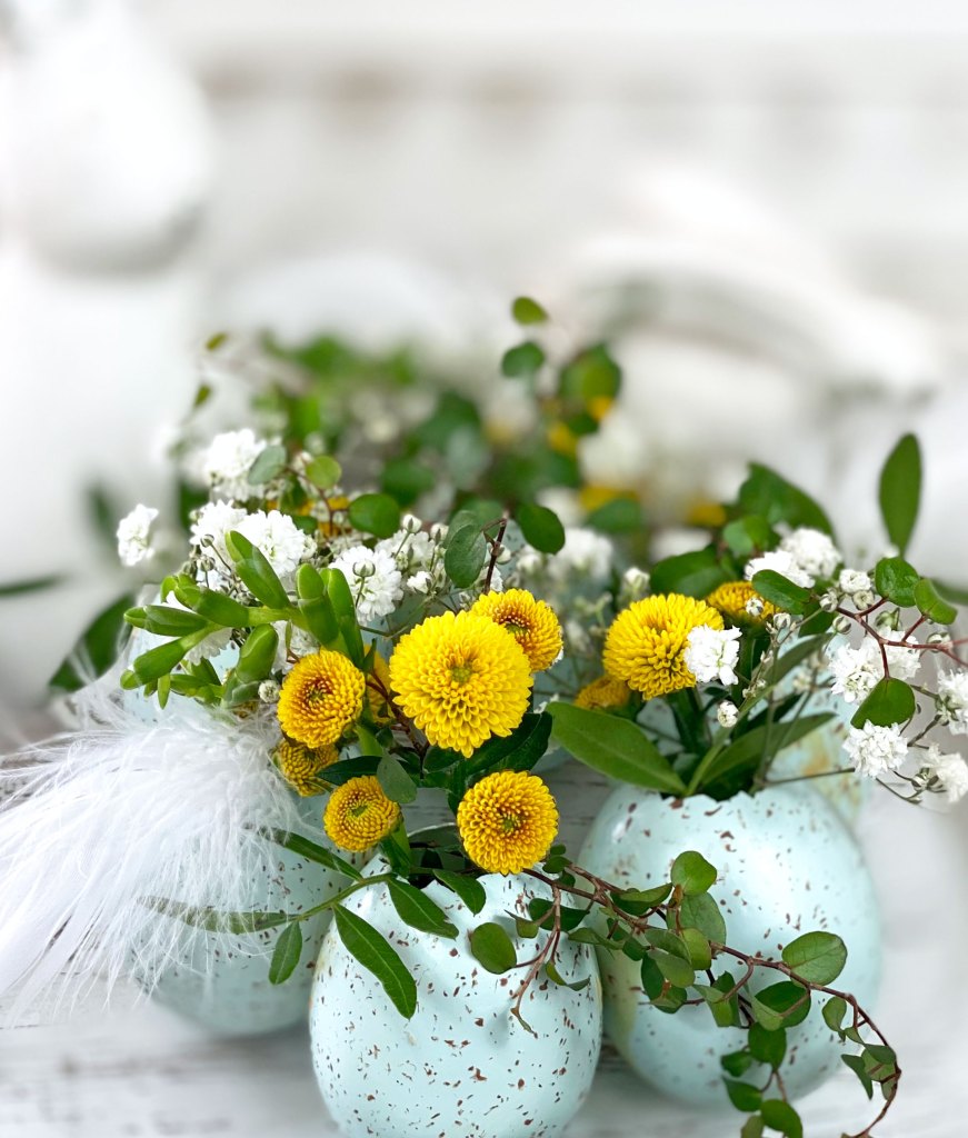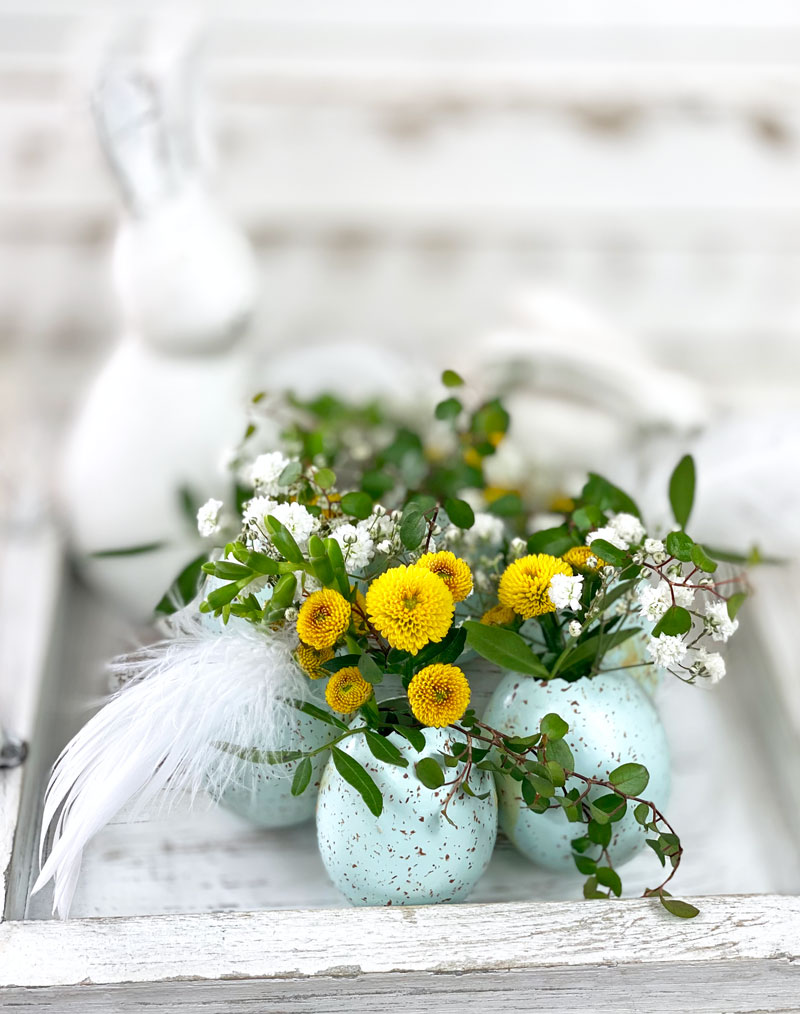 Der Eierkranz ist recht schnell gebastelt und auch für Ungeübte leicht zu machen. Damit die Grösse und Form des Kranz auf einen Dekoteller abgestimmt ist, habe ich die Eier direkt auf dem Teller verklebt und gut trocknen lassen. Die Eiervasen mit etwas Wasser befüllen und mit kleinblütigen Blumen, wie zum Beispiel mit Santini, Waxflower, Schleierkraut und Mühlenbeckia bestücken. Besonders hübsch sind natürlich Gänseblümchen und Schlüsselblumen, doch leider wurde ich noch nicht fündig und die wenigen die schon blühen, sollen lieber auf der Wiese bleiben.