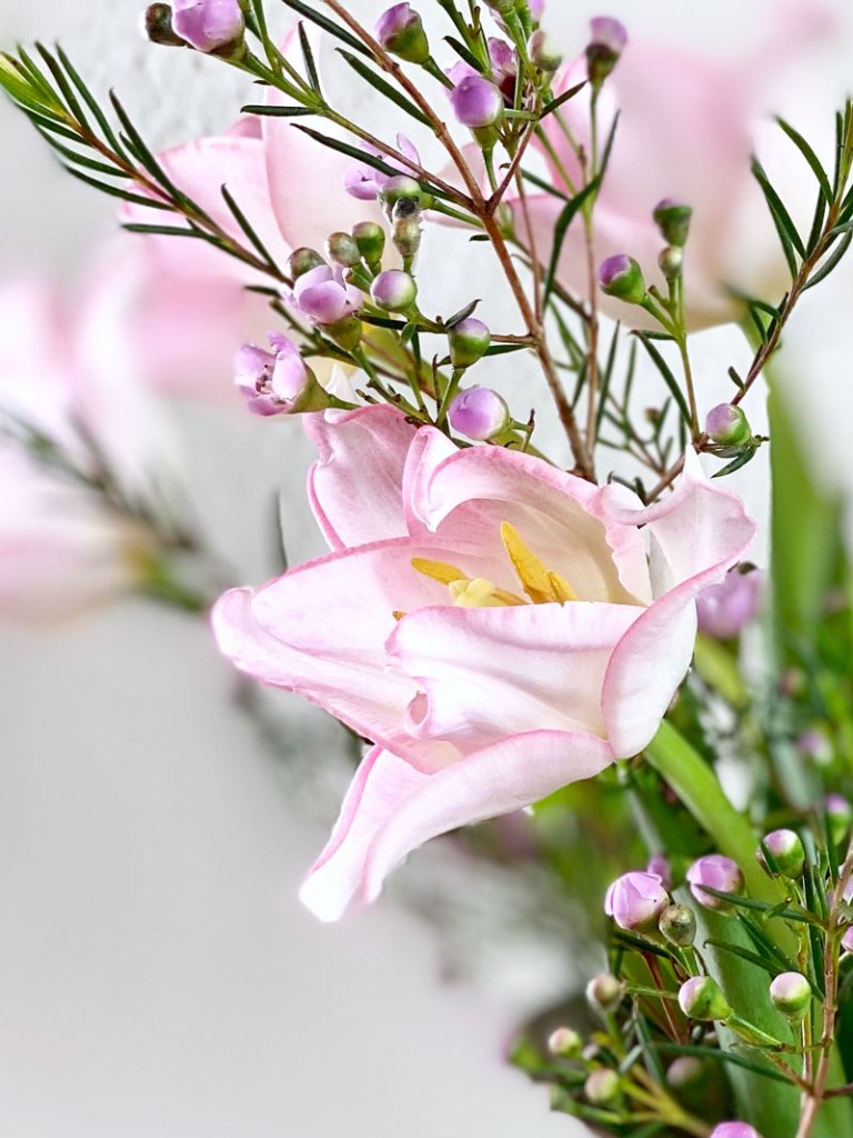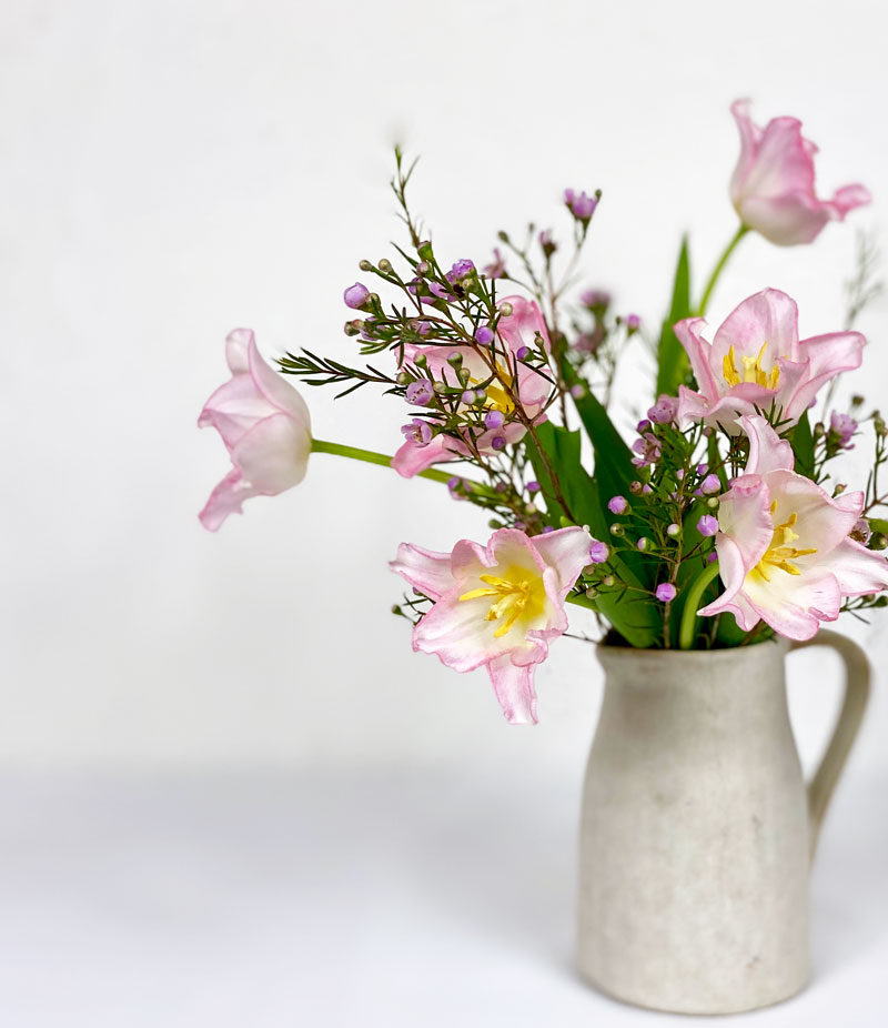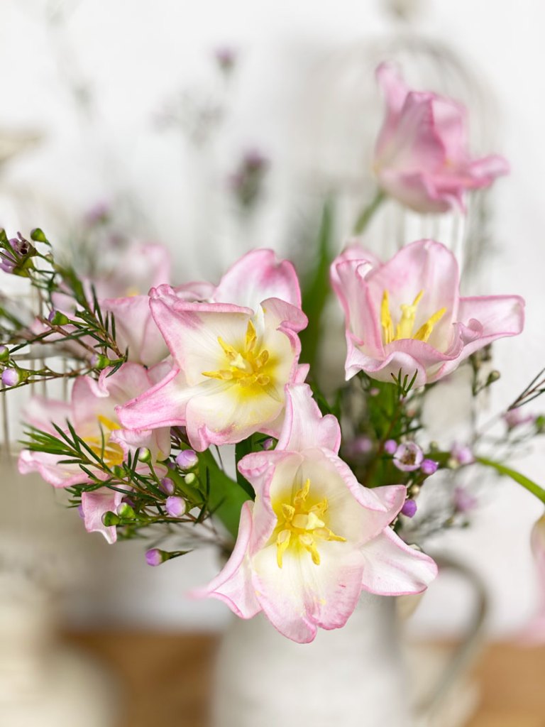 Für meinen Frühstückstisch habe ich bei meiner Floristin diese hübschen rosa Tulpen entdeckt. Sie gehören zur Papageien Sorte und mit ein paar Zweigen Waxflower sehen sie besonders hübsch aus.