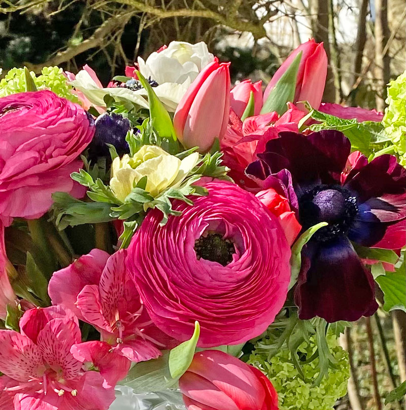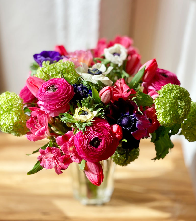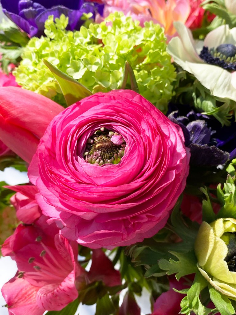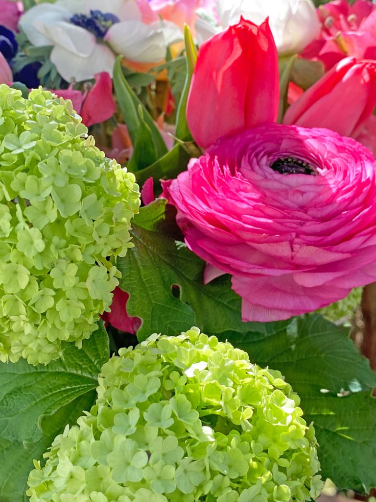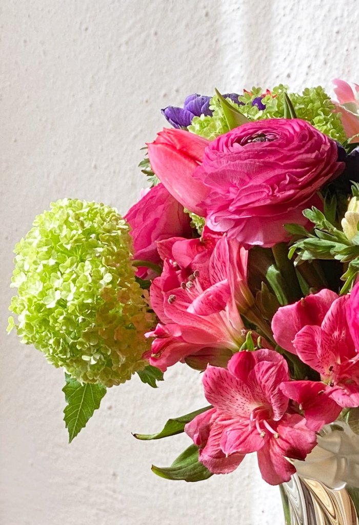Mein Wochenendstrauss ist an Farbenpracht kaum zu überbieten und ein Genuss für die Augen. Die Frühlingsblumen leuchten mir ihren Farben um die Wette – eine ist schöner als die andere. Doch der Strauss aus Ranunkel, Tulpen, Anemonen, Alstroemeria und Schneeball sieht nicht nur schön aus, er verströmt zudem einen zarten Duft nach Frühling.