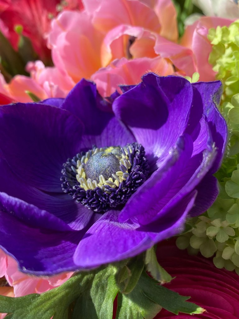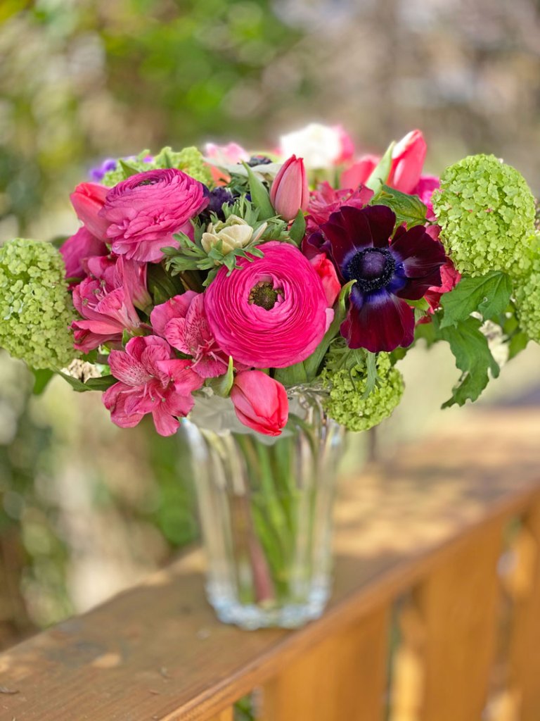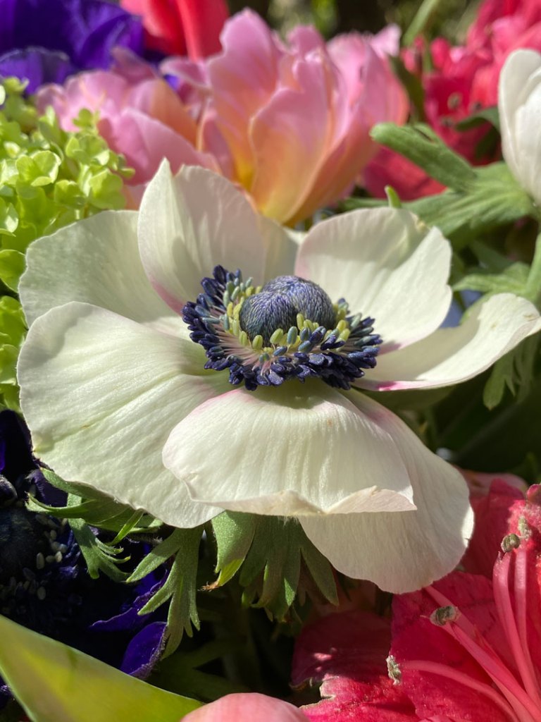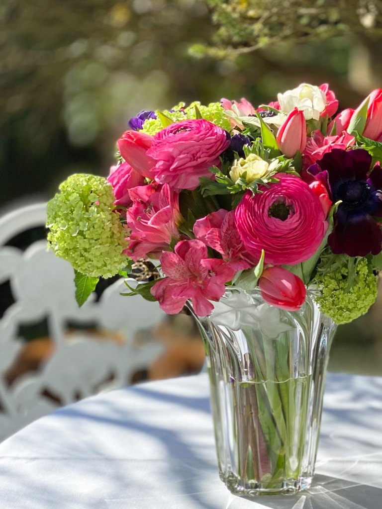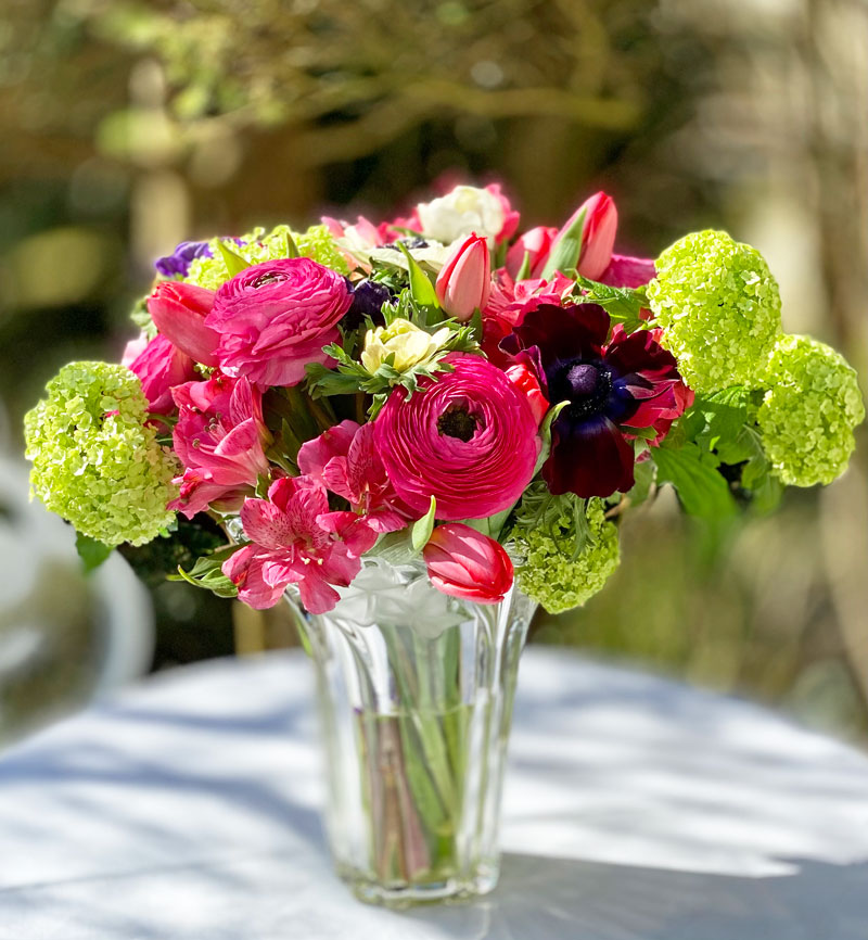 Mein Wochenendstrauss ist an Farbenpracht kaum zu überbieten und ein Genuss für die Augen. Die Frühlingsblumen leuchten mir ihren Farben um die Wette – eine ist schöner als die andere. Doch der Strauss aus Ranunkel, Tulpen, Anemonen, Alstroemeria und Schneeball sieht nicht nur schön aus, er verströmt zudem einen zarten Duft nach Frühling.