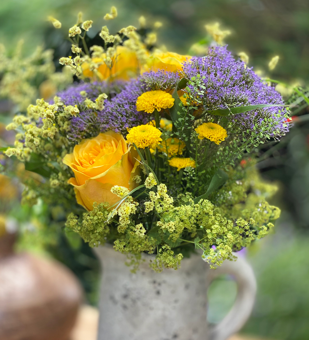 In der warmen Sommerzeit darf es ruhig ein buntes Farbenspiel sein, dass der Jahreszeit alle Ehre macht und mit der Sonne um die Wette leuchtet. Gelb ist ein Stimmungsaufheller und jeder gelbe Blumenstrauss ist ein Eyecatcher, denn die sonnengelben Blüten sind unübersehbar. Kenne niemand der sich nicht über einen gelben Blumenstrauss freut. Für meinen Wochenendstrauss habe ich mir diese Woche Rosen, Limonium, Ageratum, Santini, Hirtentäschchen und Gräser ausgesucht. Aus meinem Garten kommt noch Frauenmantel hinzu.