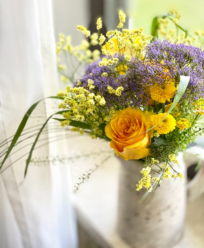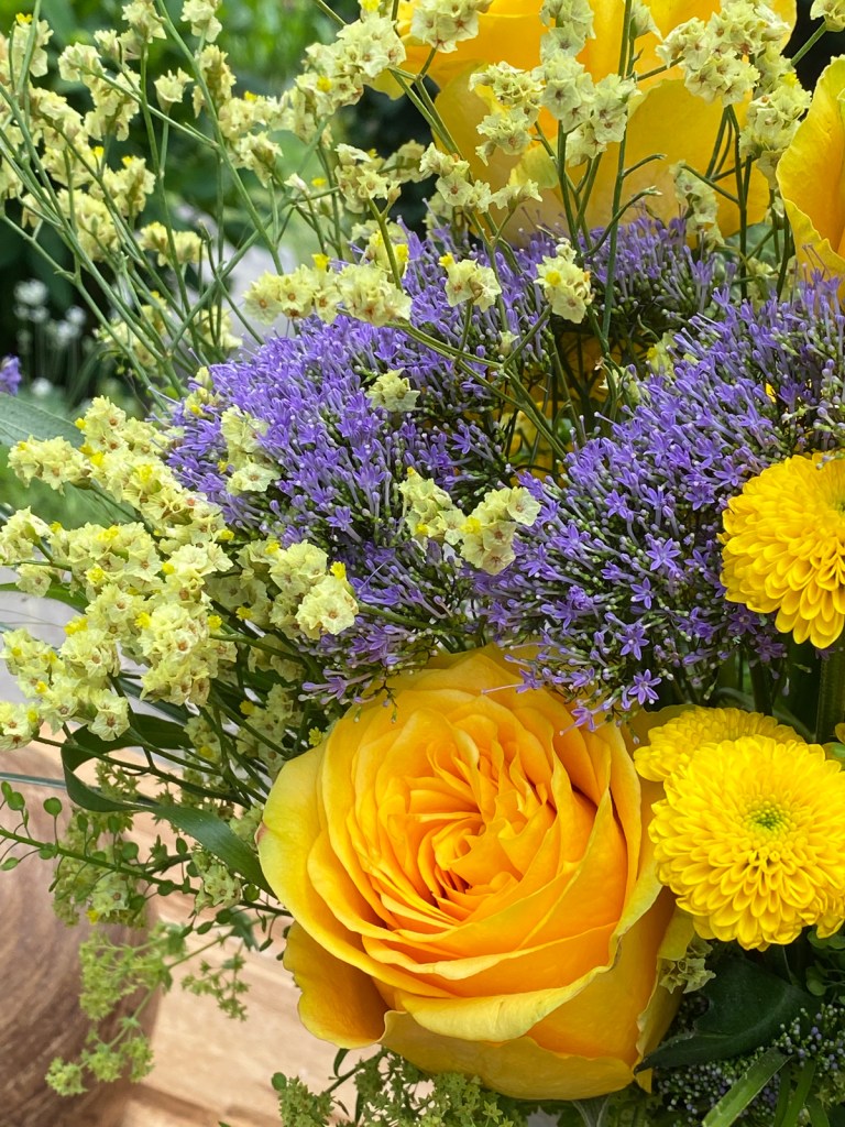 Limonium (auch Strandflieder genannt) ist ein filigranes Beiwerk mit zarten Blüten, die es in lila und gelb gibt. Es sorgt für einen lockeren und luftigen Blumenstrauss, ist zudem zum trocknen bestes geeignet. Nun kann das Wochenende kommen und ich hoffe die Sonne strahlt weiterhin so wie mein Blumenstrauss.