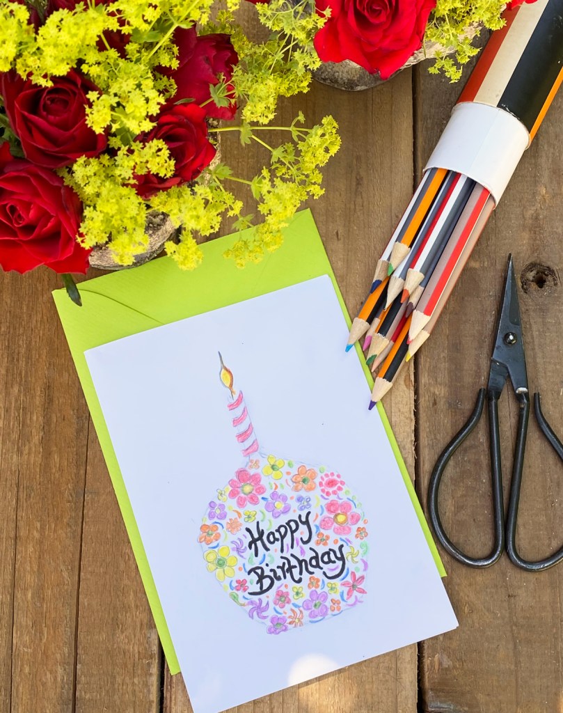 Karten gibt es in jedem Supermarkt, im Schreibwarengeschäft, ja sogar in unserem Gartencenter. Doch ich greife zu Papier, Schere und Stift – bei meiner heutigen Karte sogar zu Buntstiften. Der Beschenkte merkt sofort, dass man sich Gedanken und Mühe gemacht hat – lieblose und unpersönliche Mitbringsel und Geschenke mag keiner.