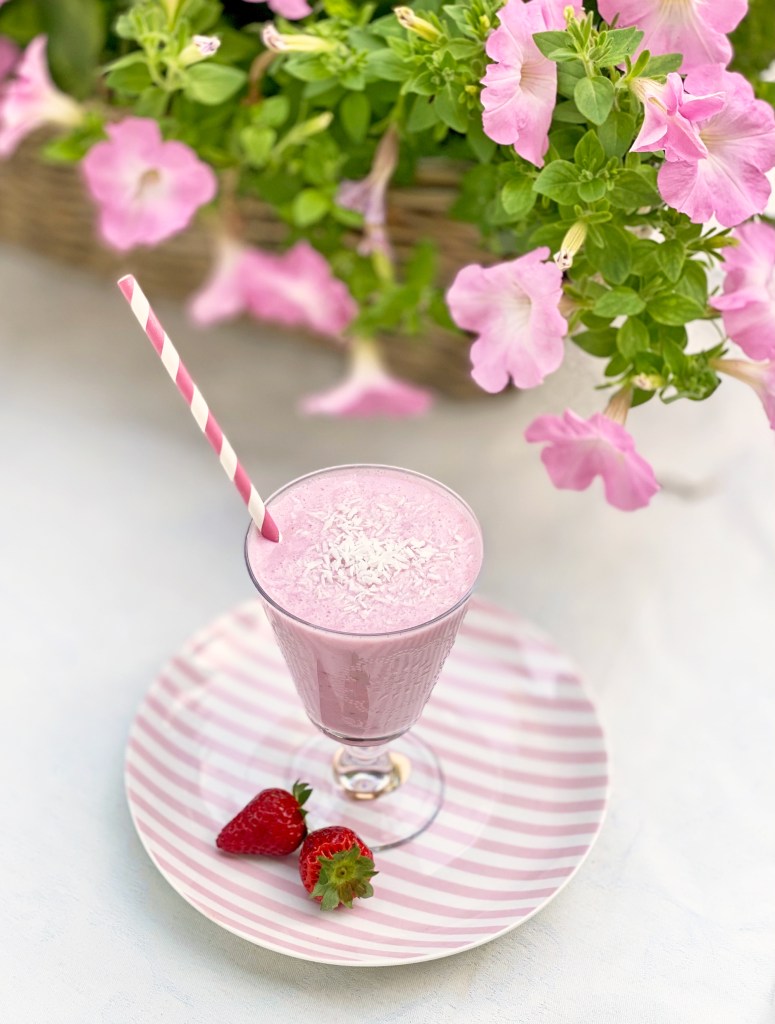 Für 2 Portionen benötigt man 500 g Erdbeeren, 400 ml Kokosmilch aus der Dose, 2 EL Zitronensaft, Zucker nach Geschmack und ein paar schneeweisse Kokosflocken. Die Erdbeeren abbrausen, kleine Stücke schneiden, in einer Schüssel mit Zucker und Zitronensaft vermengt und im Kühlschrank eine Stunde ziehen lassen. Die Kokosmilch zugeben und mit einem Mixer oder Pürierstab mixen, auf Gläser verteilen, mit Kokosflocken servieren und geniessen.