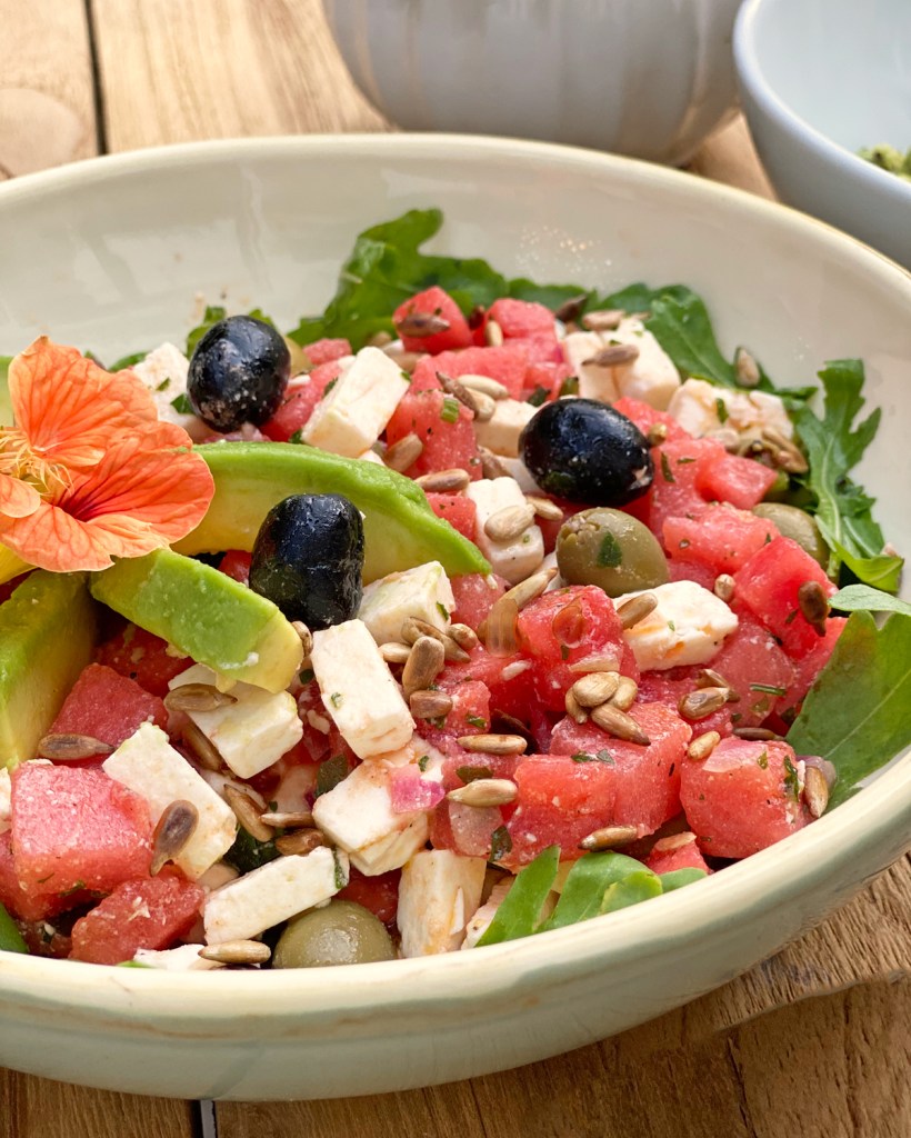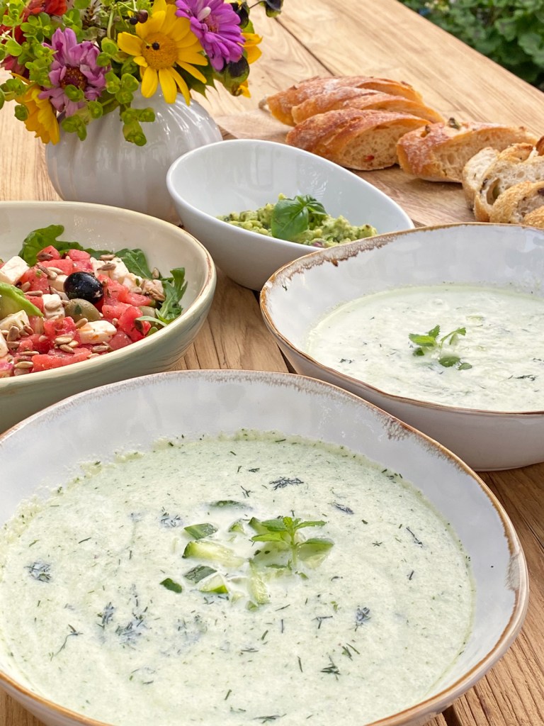 Für einen lauen Sommerabend ein 3 Gänge Menü ? Nein danke, dafür eine leichte Gurkensuppe, Salat aus Melone, Feta, Rucola, Oliven und Sonnenblumenkerne. Dazu gab es frisches Olivenbrot von unserem Bäcker und einen Brotaufstrich von der Avocado. Anstatt zu grillen habe ich mich für leichte, sommerliche Gerichte entschieden und Fleisch nicht vermisst.