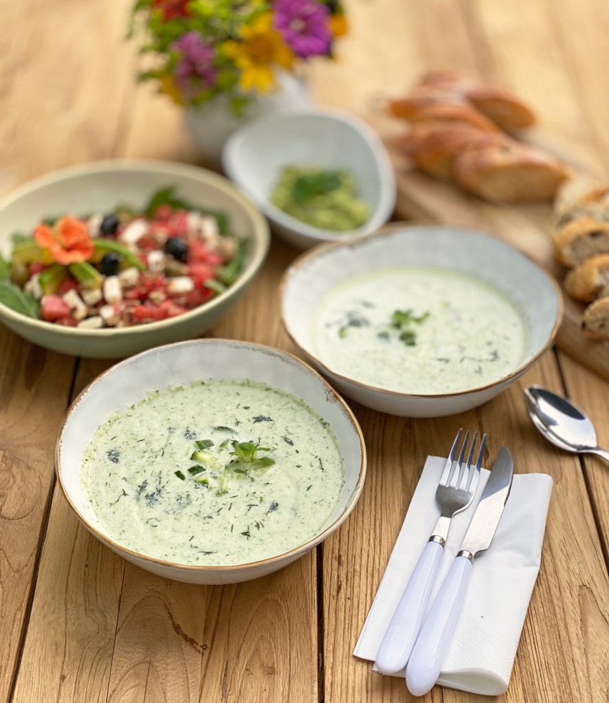 Für einen lauen Sommerabend ein 3 Gänge Menü ? Nein danke, dafür eine leichte Gurkensuppe, Salat aus Melone, Feta, Rucola, Oliven und Sonnenblumenkerne. Dazu gab es frisches Olivenbrot von unserem Bäcker und einen Brotaufstrich von der Avocado. Anstatt zu grillen habe ich mich für leichte, sommerliche Gerichte entschieden und Fleisch nicht vermisst.