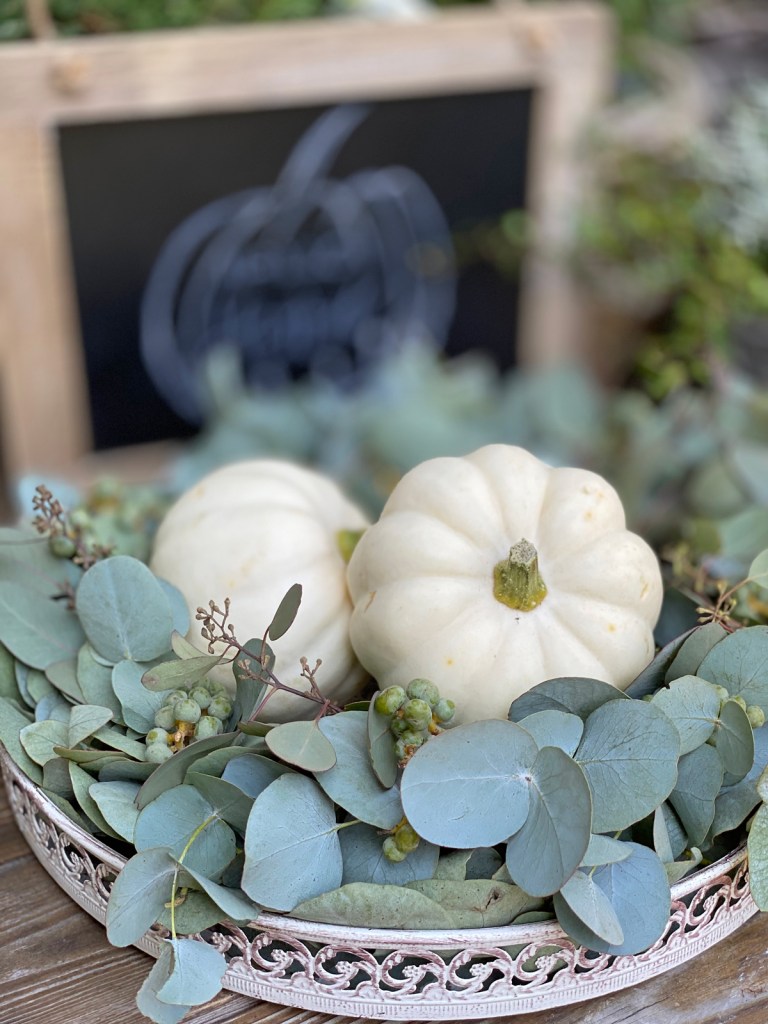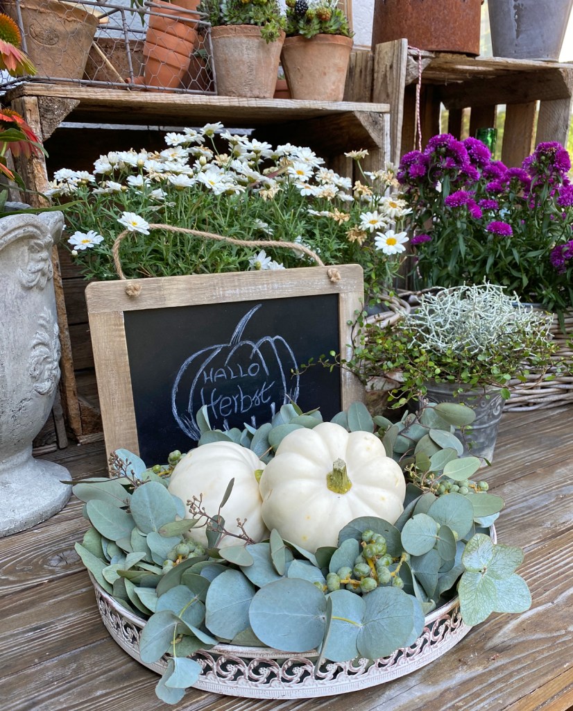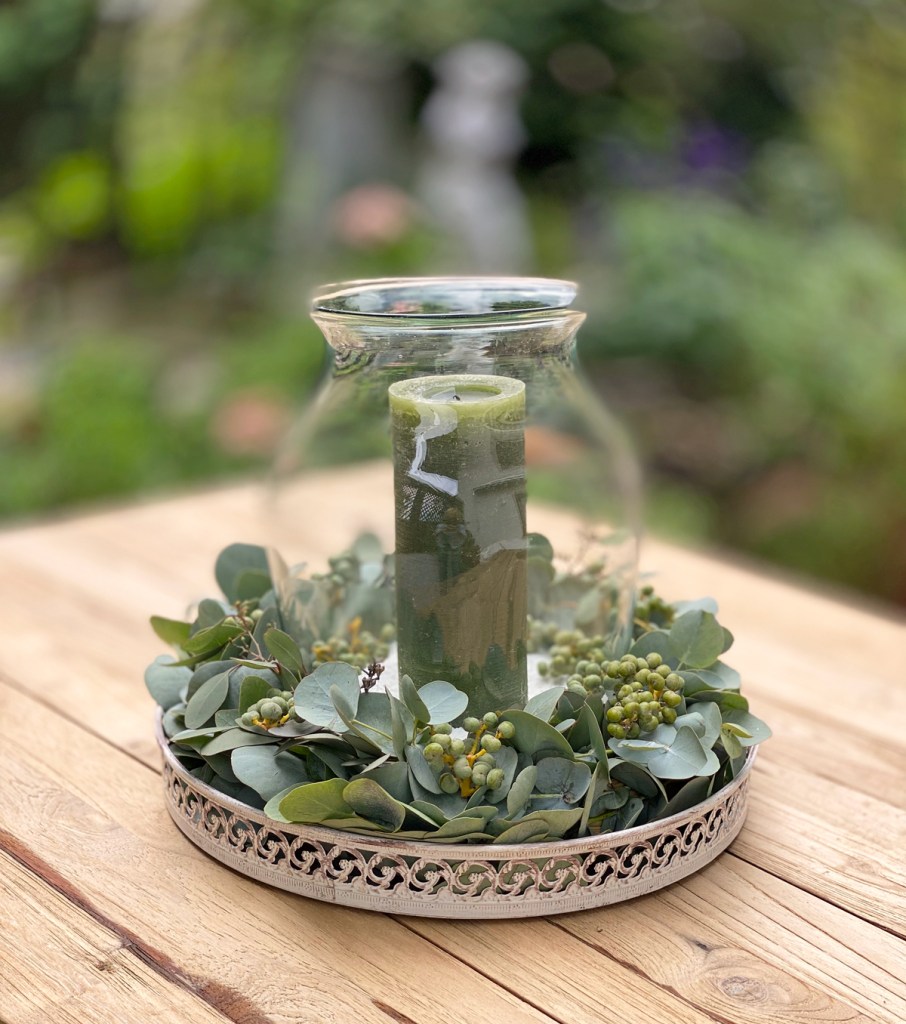 Der Kranz schmückt nun meinen grossen Esstisch an dem ich gerne arbeite und meine Blog Berichte am Laptop schreibe. Als Tischschmuck eignet sich der Eukalyptus bestens, an manchen Tagen mit dem Kerzenglas, an manchen ganz einfach mit weissen Kürbis und der Duft begleitet mich von Früh bis Spät.
