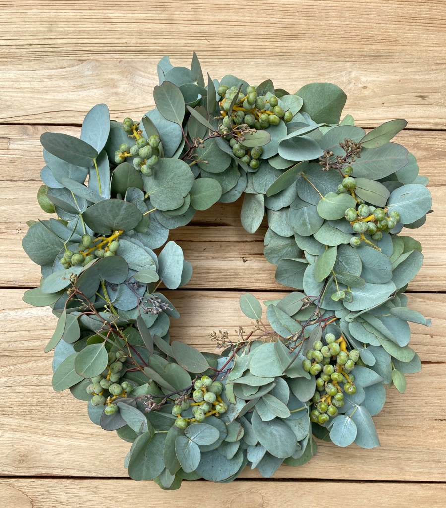 Einen Kranz zu binden hat für mich etwas beruhigendes und am Ende freut sich das Auge über das Ergebnis. Mein liebstes Material dafür sind die Zweige vom Eukalyptus – es sieht nicht nur schön aus, sondern duftet ganz herrlich, hält lange und sieht auch getrocknet hübsch aus.