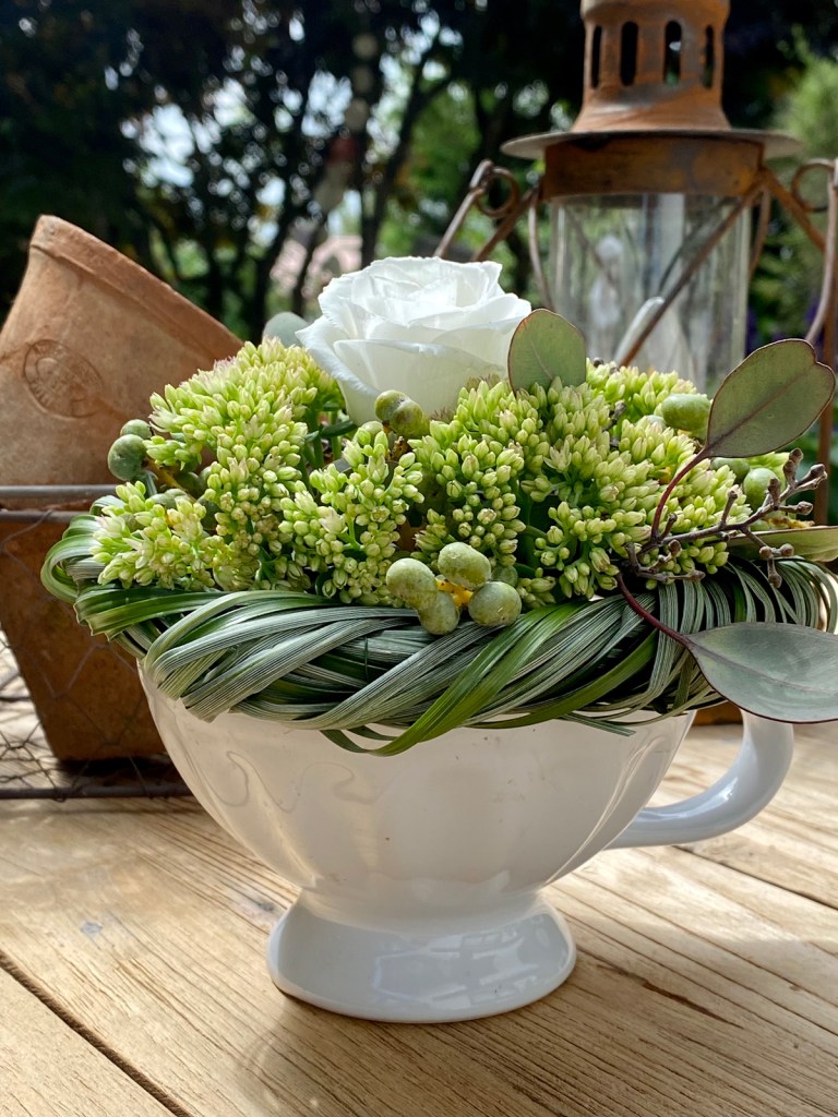 Warum nicht einmal Alltagsgegenstände verwenden, zum Beispiel die hübsche Tasse, die nun schon seit Jahren im Schrank steht, aber nie verwendet wird. Teekannen, hohe Müslischalen, Suppenterrinen, Nudelsiebe oder Tassen – Blumen fühlen sich in nahezu allen Gegenständen wohl und daher sind der Phantasie keine Grenzen gesetzt.