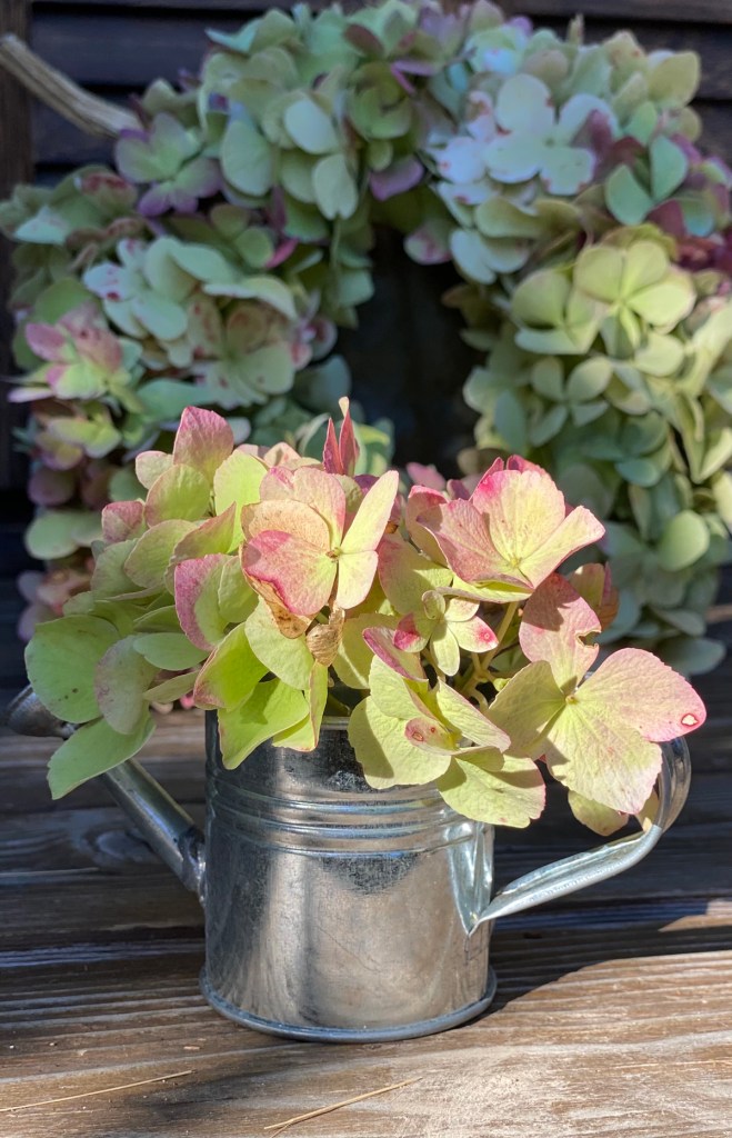 Da ich die Hortensienblüten ein wenig zu grosszügig geschnitten habe, blieb noch genügend Material für einen kleinen Kranz der nun in der Diele seinen Platz gefunden hat und mit der Mini Giesskanne einfach bezaubernd aussieht. Die Hortensien haben dieses Jahr wegen des extrem kalten Frühjahrs sehr spät geblüht, doch dafür sind sie im Herbst noch wunderschön anzusehen und man hat das Gefühl sie möchten noch ewig weiter blühen.