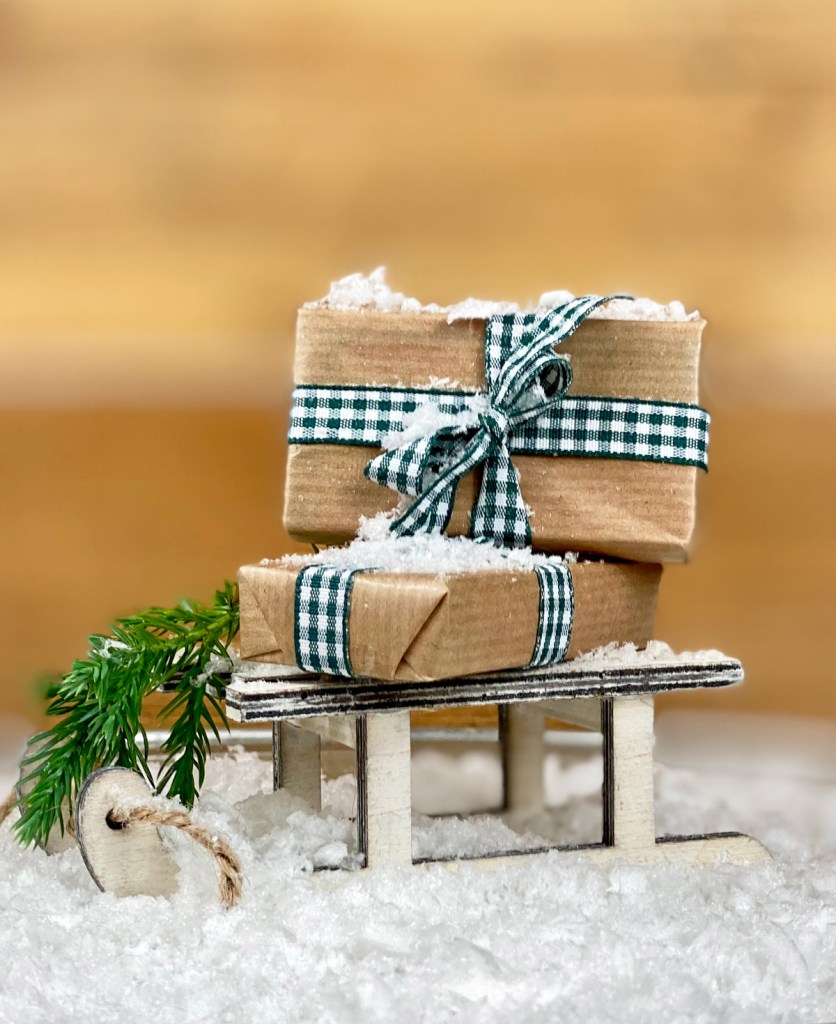 Zuerst werden alle Geschenke in Kraftpapier oder Jute verpackt. Das Papier sollte von guter Qualität sein, damit nichts durchscheint und auch nicht so schnell reissen kann. Das schlichte Kraftpapier lässt sich mit farbigen Schleifen und Accessoires wunderbar aufwerten. Anschliessend kommt der kreative Teil, denn schliesslich soll jedes Geschenk ein Unikat werden. Gerne arbeite ich mit verschiedenen Schleifen, Paketschnur und farbigen Bänder, mit Naturmaterial wie Tannenzweige oder Illex. Das Kränzchen habe ich mit Rosmarin gebunden und der Ring wurde mit Nadel und Faden aus frischen Cranberrys gemacht. Nicht jeder hat in seinem Garten Nadelbäume oder eine Thujahecke, aber seit Anfang Dezember wird in den Baumärkten und Gartencenter, Bündel mit verschiedenen Tannengrün angeboten. Damit auch jeder sein Päckchen unter den Tannenbaum findet habe ich auf der Rückseite den Namen aufgestempelt.