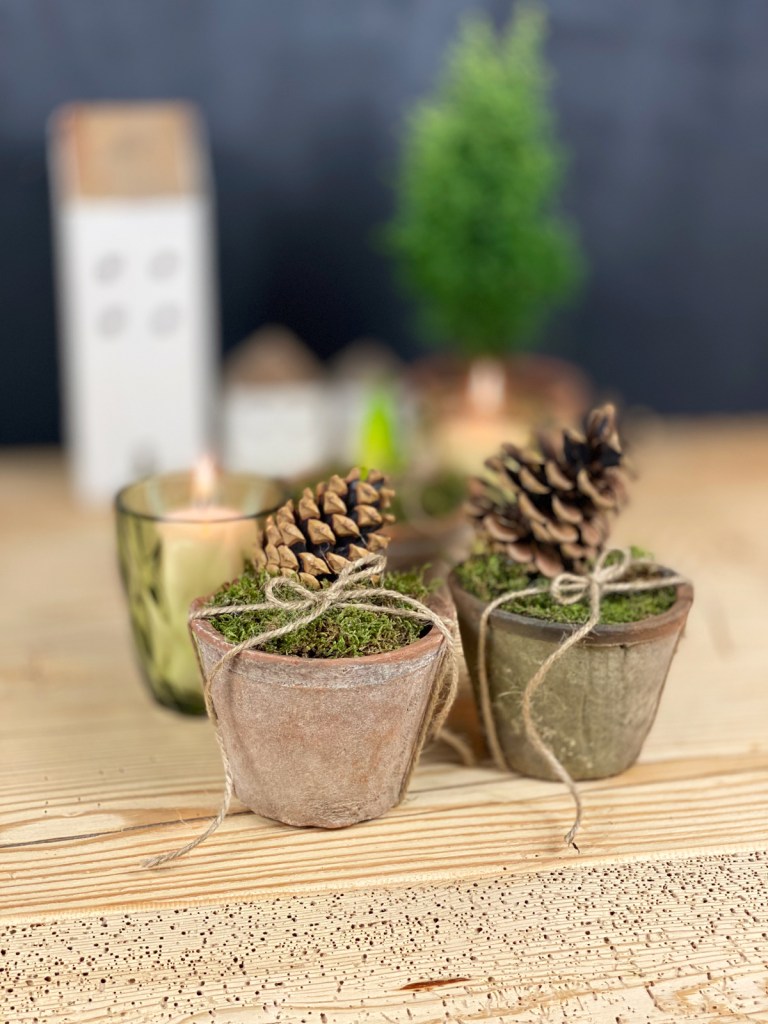 Für meine Küchenfensterbank habe ich kleine Tontöpfe mit Moos gefüllt, mit einer Paketschnur verziert und einen Zapfen aufgeklebt. Mit Kerzengläser eine kleine, hübsche Deko wenn es draussen bereits dunkel ist und der Winter noch lange nicht enden will.