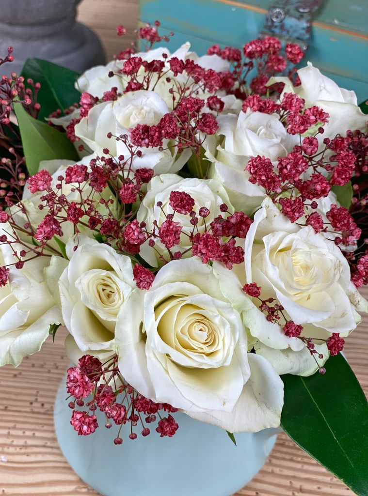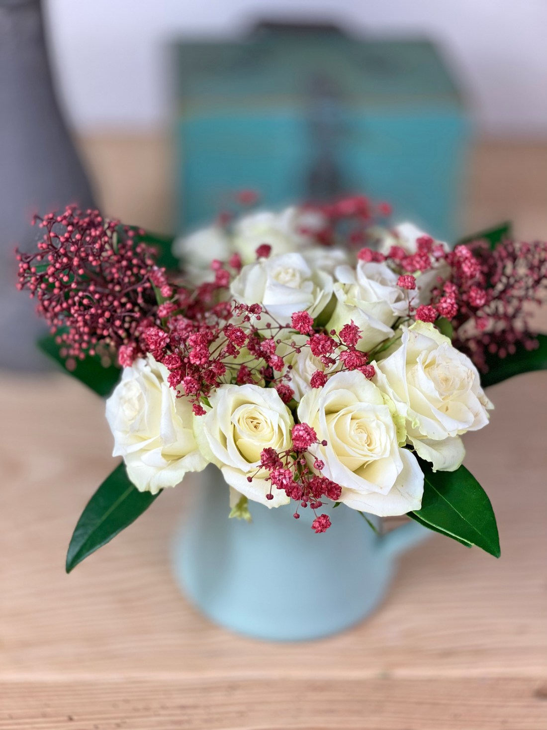 Grosse Rosensträusse sind beeindruckend, egal wo man sie platziert, doch auch der kleine Rosenstrauss mit weissen Rosen, gefärbtem roten Schleierkraut und Skimmia passen perfekt auf den Esstisch. Schliesslich möchte man seinem Gegenüber auch in die Augen kucken können.