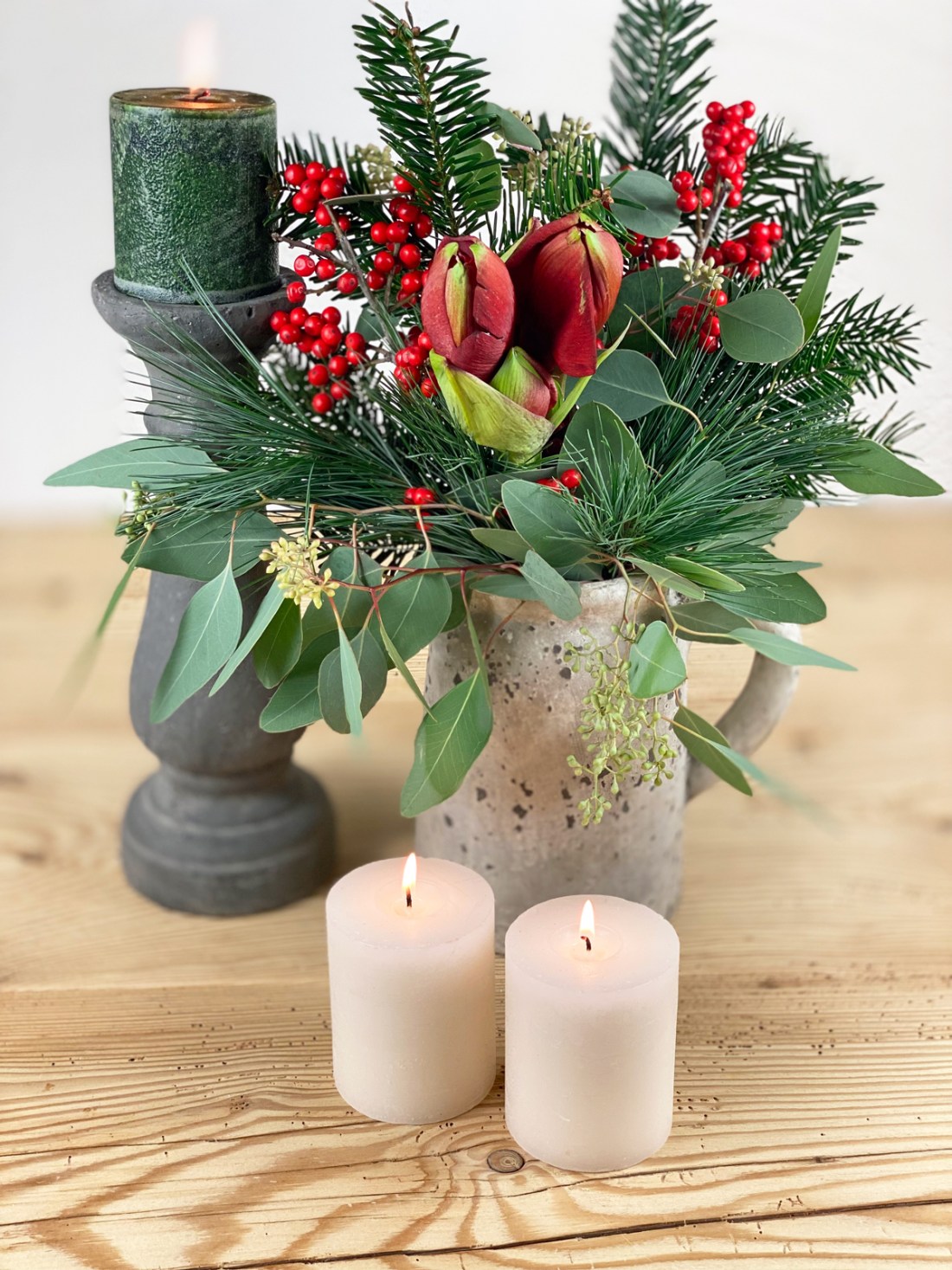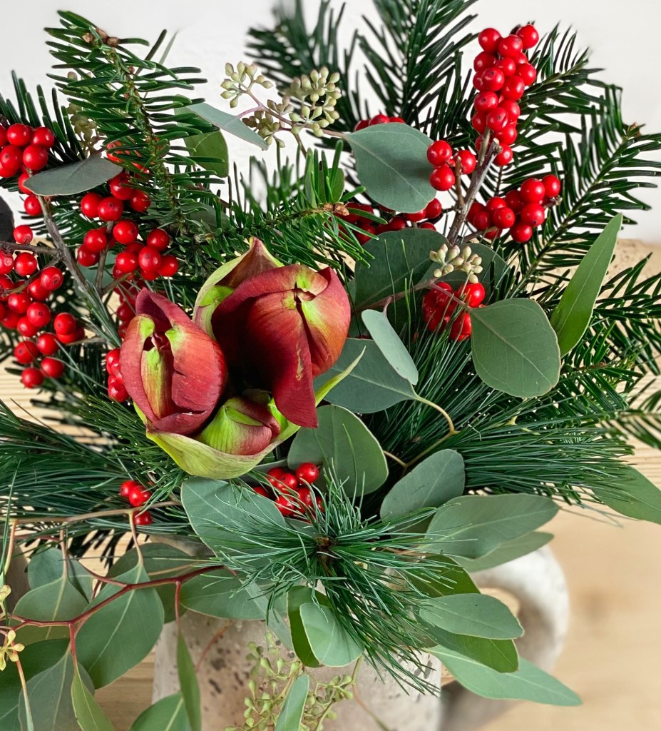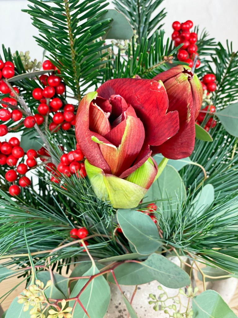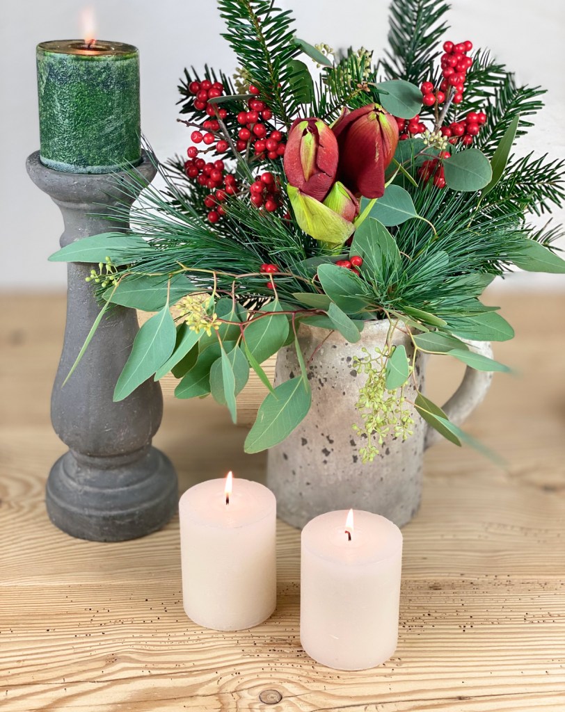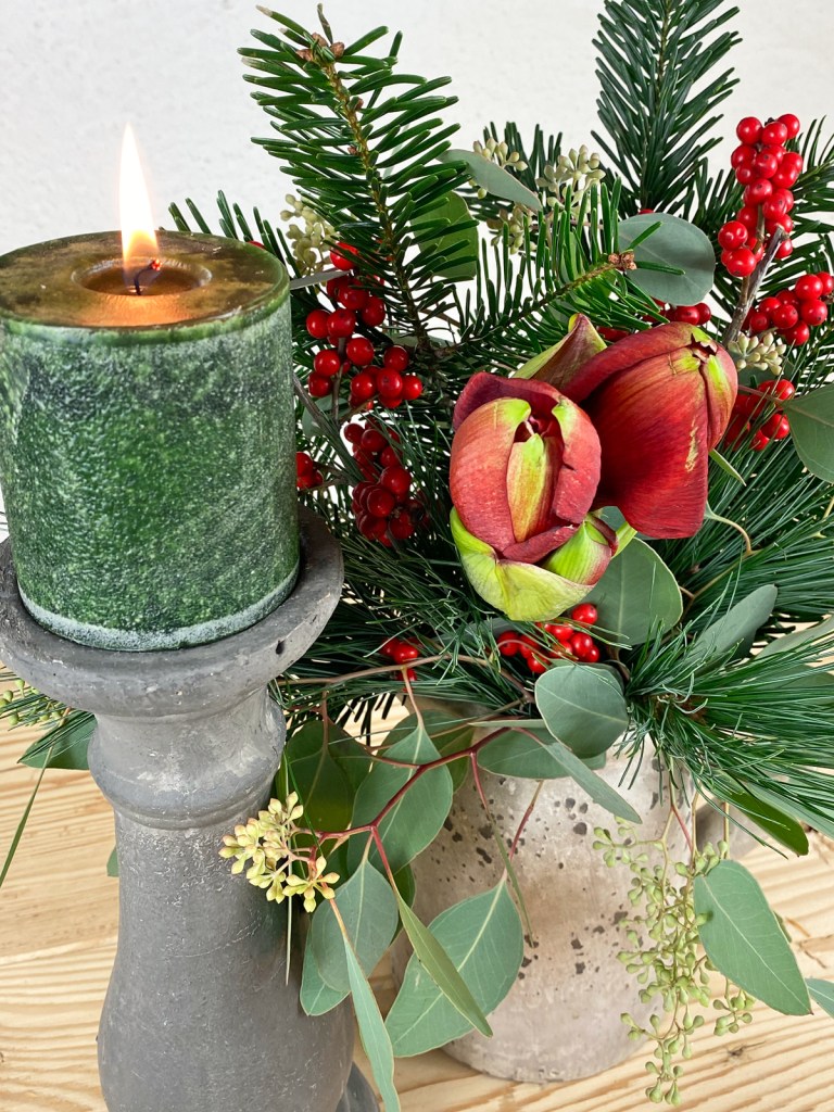 Trotzdem habe ich mich für einen winterlichen Strauss mit Amaryllis, Tannengrün, Kiefer und Ilex entschieden. Bevor die Amaryllis ihren Platz in der Vase einnimmt, sollte sie noch einmal frisch angeschnitten werden. Dabei trage ich dünne Handschuhe, da der Saft der Amaryllis giftig ist und Hautreizungen auslösen kann. Die Stiele sind in der Regel sehr lang und müssen passend für die Vase geschnitten werden. Der Stiel neigt dazu, sich an den Enden aufzurollen. Das erschwert die Wasseraufnahme und lässt das Ende oft aufweichen – mit einem Tesafilmstreifen kann Abhilfe geschaffen werden, der einfach um das untere Stielende geklebt wird.