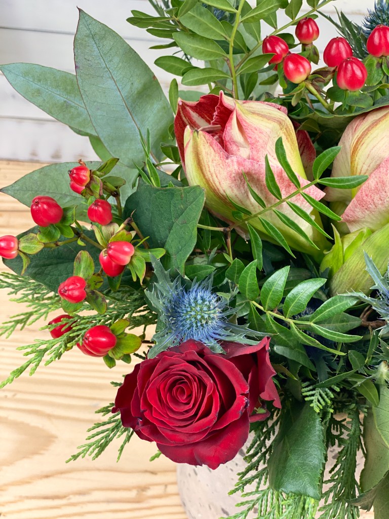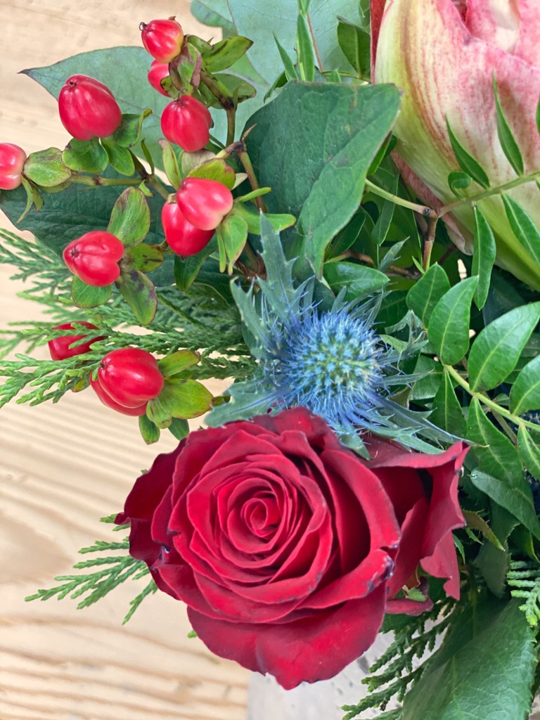 Für meinen Strauss habe ich Amarylis, Rosen, Disteln, Hypericum, Pistaziengrün, Eukalyptus und Thuja ausgesucht und bin mit dem Ergebnis ganz zufrieden.