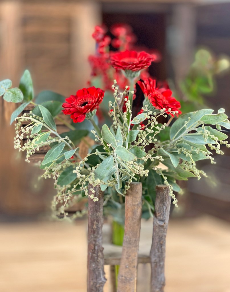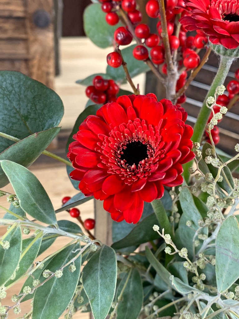 Ich habe mich für Rot entschieden und die Germini zusammen mit einem Zweig Ilex und Eukalyptus in eine Holzvase gestellt. Dazu Mimose, ein mintfarbenes Beiwerk welches leicht silber schimmert und schön duftet. Für meinen Esstisch habe ich eine Kugelvase ausgewählt und eine besonders schöne Rose in rot-orange eingebunden.