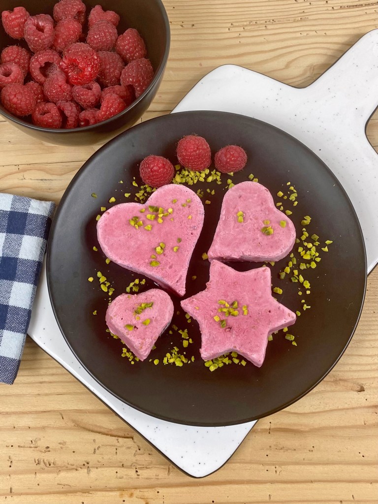 Himbeeren antauen lassen und im Mixer pürieren und in eine Schüssel geben. Mascarpone, Sahne, Zucker und das Mark der Vanilleschote mit den Himbeeren gut vermengen. Alufolie um die Plätzchen Ausstecher wickeln und die Masse eingiessen. Ins Tiefkühlfach stellen und 6 Stunden warten. Danach die Ausstecher antauen lassen und das Eis auf Teller anrichten. Mit Pistazien und frischen Himbeeren garnieren.