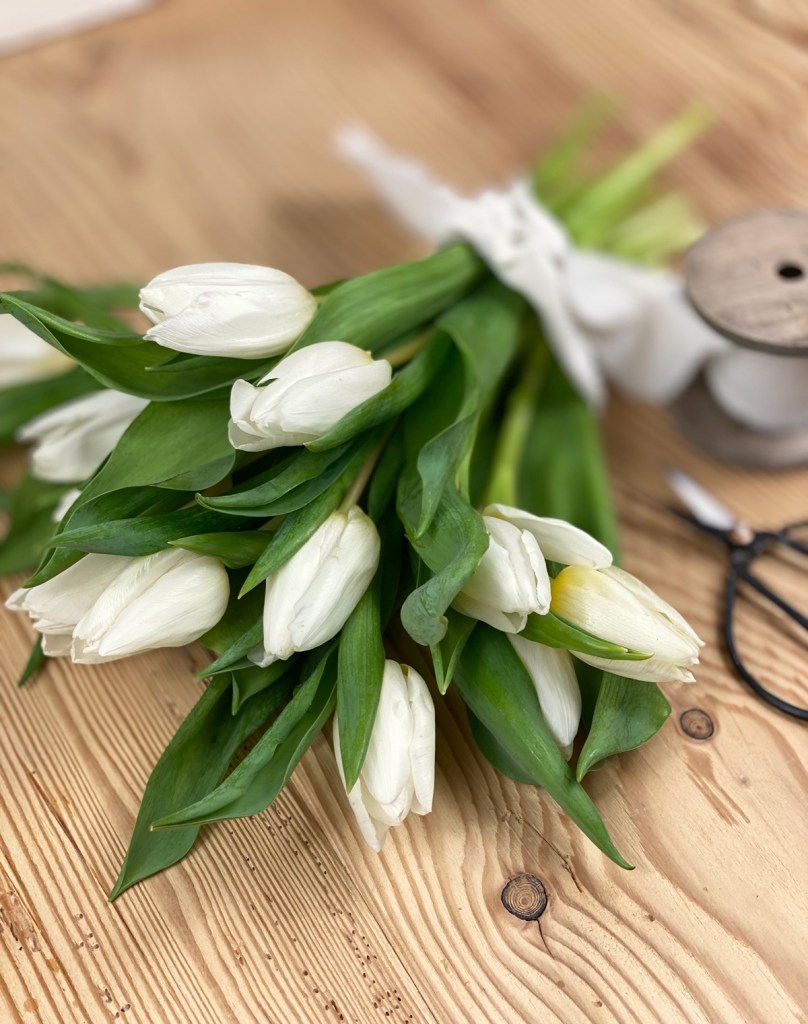 Bevor die Tulpe in die Vase kommt, werden sie mit einem scharfen Messer gerade angeschnitten, die unnötigen Blätter entfernt und in lauwarmes Wasser gestellt. Tulpen stehen gerne kühl, somit ist klar – direkt neben der Heizung oder auf der sonnigen Fensterbank ist es für Schnittblumen zu warm und wenn der Strauss über Nacht im kühlen Keller steht halten die Tulpen länger. Der Wasserstand sollte täglich kontrolliert und nachgefüllt werden. Alle drei Tage wechsle ich das Wasser komplett aus und so halten die Tulpen über eine Woche.